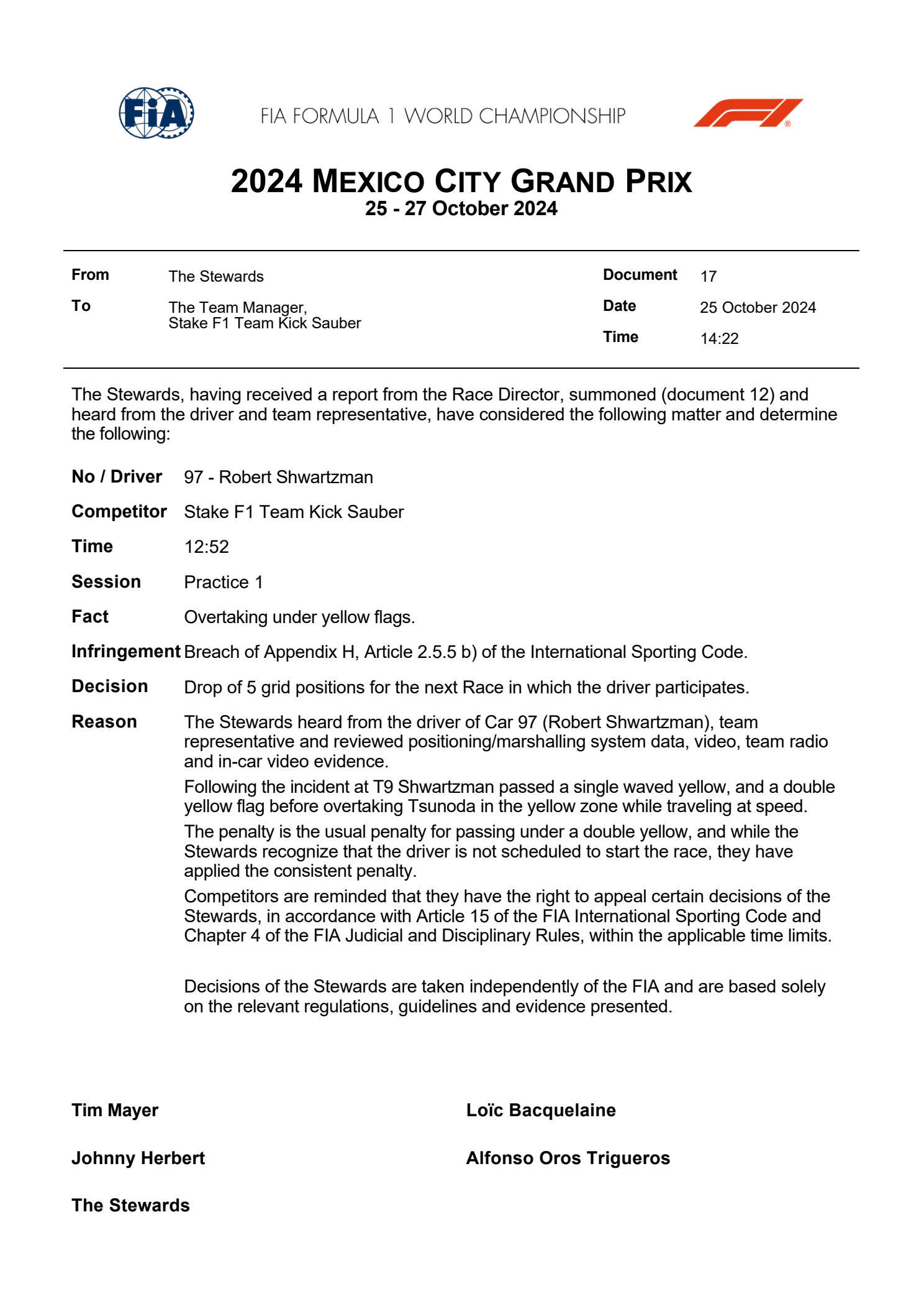 这起事故之后,该路段出现了双黄旗,舒瓦茨曼在双黄旗下超越角田,被罚在下一场正赛里接受5位罚退。