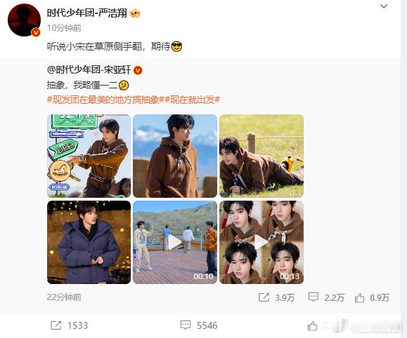 #严浩翔cue宋亚轩侧手翻# #严浩翔想看宋亚轩草原侧手翻# 严浩翔 cue 宋亚轩侧手翻,这展示了团队内部的互动和活力,希望宋亚轩能满足期待。
