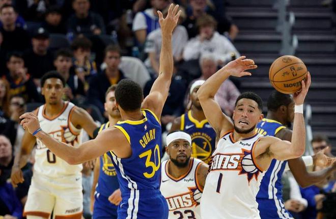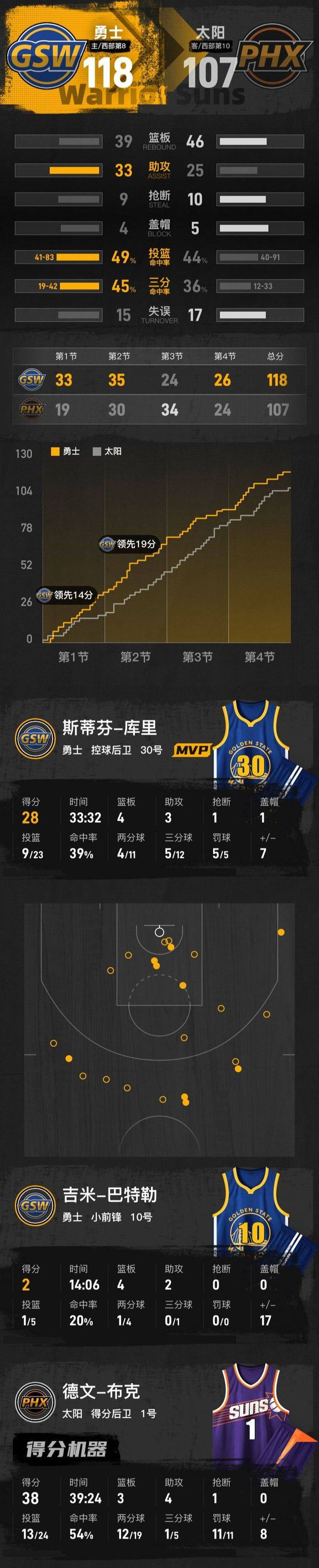 末节,穆迪和波斯特的三分球又为勇士稳住局面,但太阳相当顽强,马威补扣得手,布克晃开两个防守人的跳投也中,分差依然有8分。此后,勇士队凭借经验一直压制太阳。库里在比赛还没结束的时候,也提前打卡下班了。最终,全场打完,勇士118-107射落太阳,止住两连败。