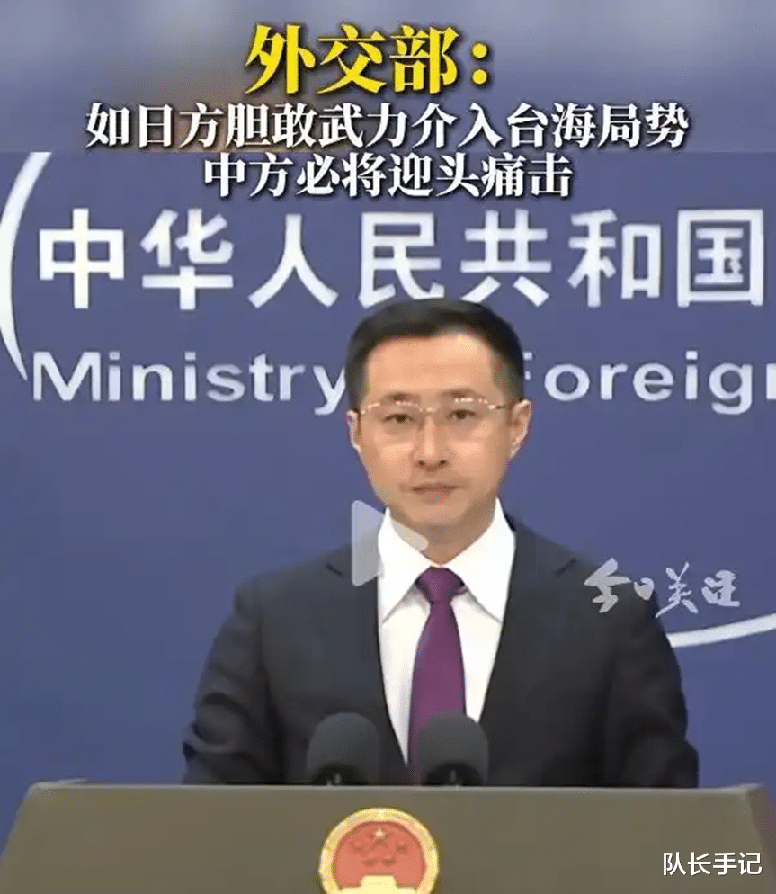 其实早在11月13号外交部例行记者会上,外交部发言人林剑就回应称“如日方胆敢武力介入台海局势,将构成侵略行为,中方必将迎头痛击。”