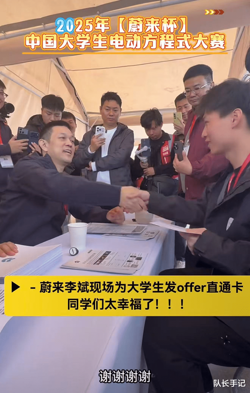 一幕是,太原理工大学车队的老队长,今年考上了985高校山东大学研究生,“转会”到了山大车队。太原理工的新任队长,特地给老队长准备了一件队服当退役纪念礼物。队服上铺满了队内成员以及其他车队的签名和祝福,连蔚来CEO李斌也在衣服上签下“一起造好车”。老队长收到礼物非常激动,哽咽落泪。