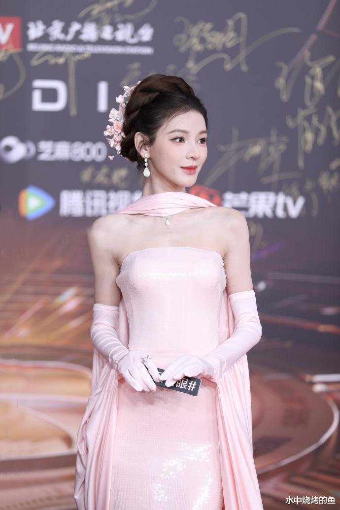 同样妆造不搭的还有女星张予曦,一袭粉色长裙仙气飘飘,不过盘发造型和服装组合起来并不和谐,手套的搭配就更显得离谱了,直接拉低了妆造的高级感。不过张予曦的脸部状态很精致,一定程度上弥补了造型上的劣势。