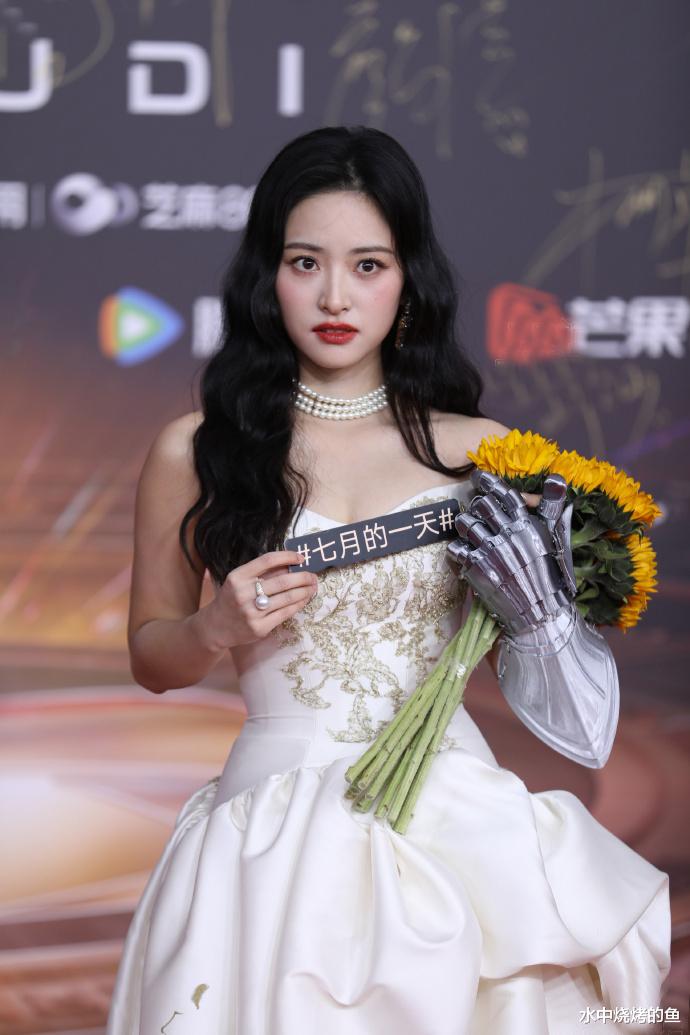 沈月也直接打破了以往的“甜妹”形象,从公主变成了骑士,一袭白色礼服搭配金色刺绣华丽又大气,珍珠项链的点缀也让她看上去优雅成熟,不过手中的向日葵显得比较随意了,破坏了造型的质感和美感。