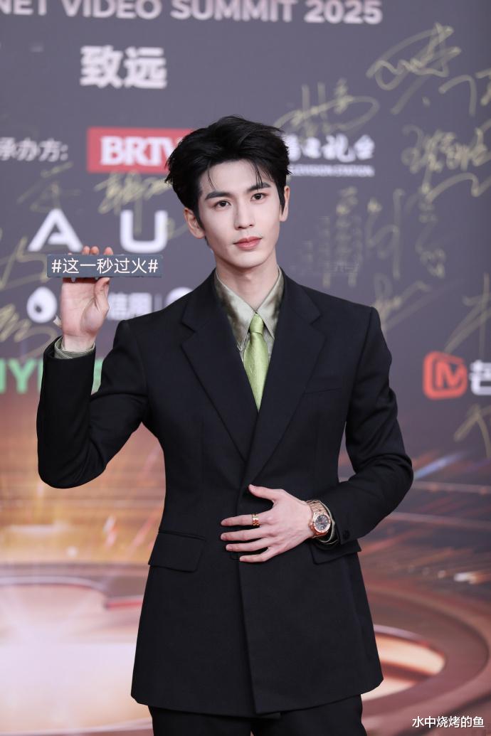 张凌赫以电视剧《爱你》中何苏叶医生的形象亮相红毯,黑色西装搭配墨绿色衬衫,看起来贵气十足,典型的360度无死角的帅气。