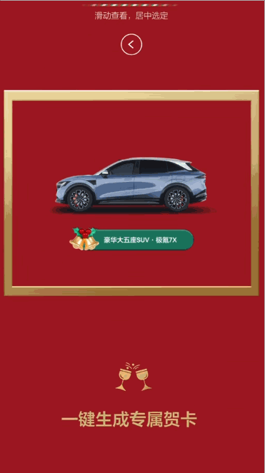 左滑选择素材+点击生成专属贺卡,页面暗藏试驾引流入口。