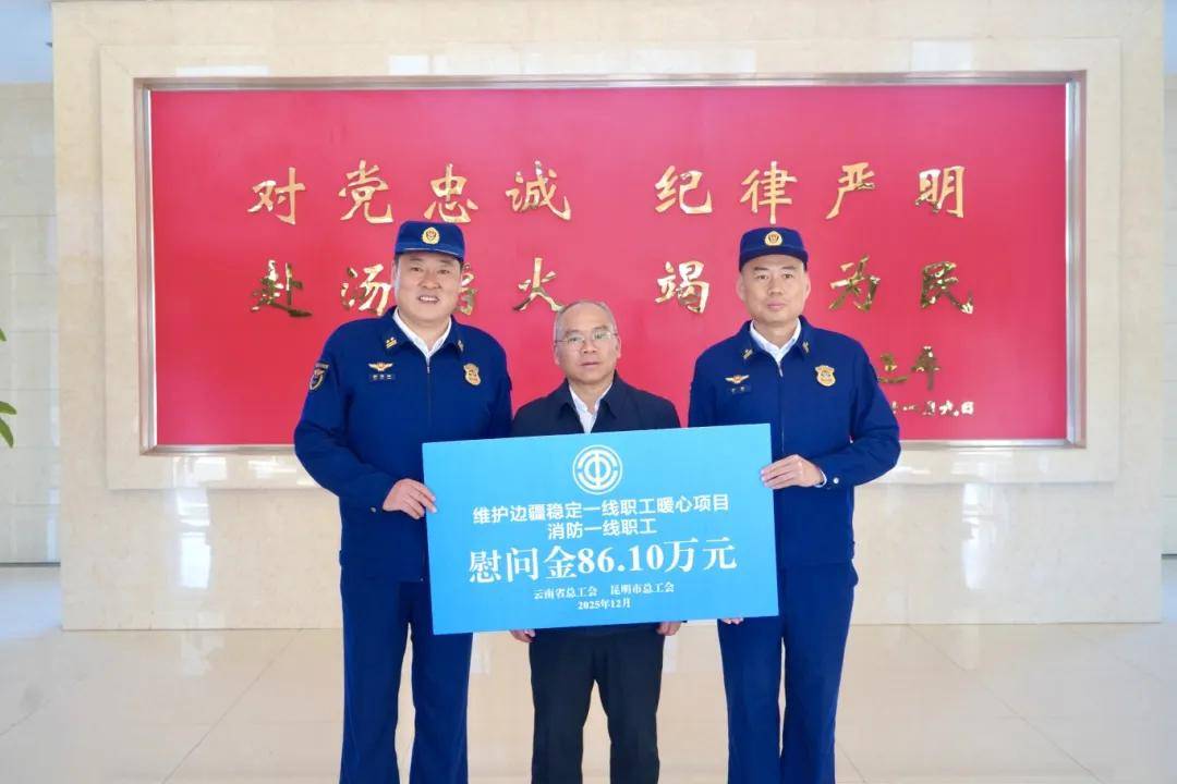 2025年12月19日,昆明市人大常委会副主任,市总工会党组书记、主席李开德率慰问组,带着市委、市政府和市总工会的深情厚谊,为长期奋战在应急救援一线的消防指战员和云南省职工医疗互助活动受助职工送去温暖与鼓励。