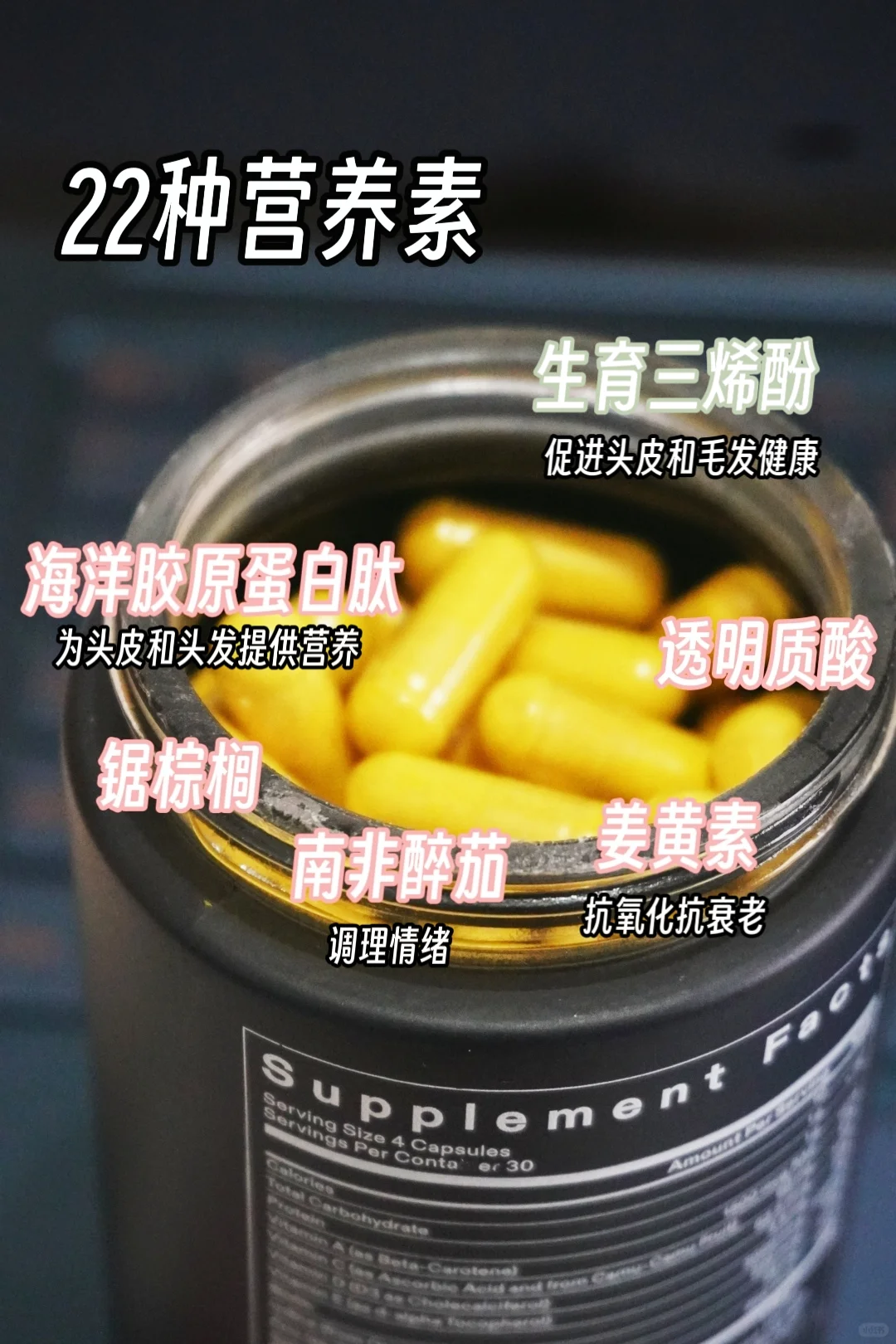 胶囊中的22种营养素都是植萃成分,干干净净的配方很安心。