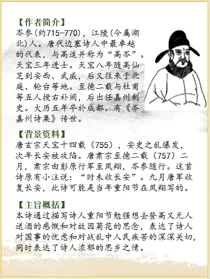 唐玄宗天宝十四载(755),安史之乱爆发,次年长安被攻陷。唐肃宗至德二载(757)二月,肃宗由彭原行军至凤翔,岑参随行。这首诗原有小注说:“时未收长安”。九月唐军收复长安,此诗可能是当年重阳节在凤翔写的。