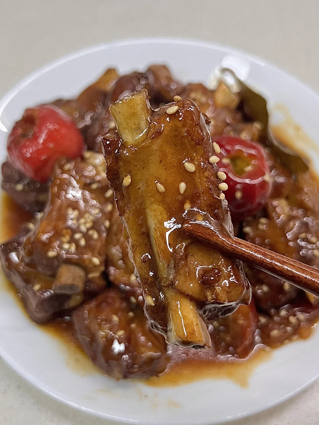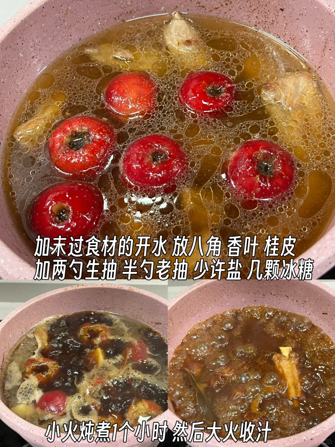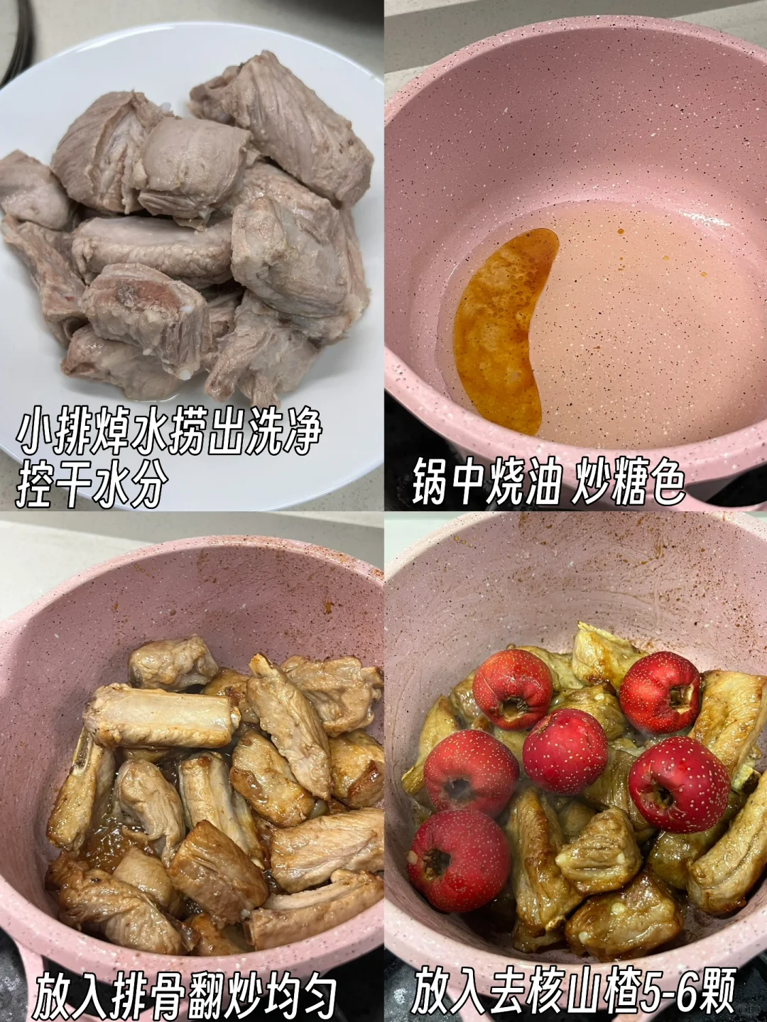 1️⃣小排焯水捞出洗净,控干水分备用;锅中烧油,炒糖色 2️⃣放入排骨翻炒均匀,放入5-6颗去核山楂 3️⃣加入末过食材的开水,放八角、香叶、桂皮、两勺生抽、半勺老抽、少许盐、几颗冰糖 4️⃣小火炖煮1个小时,然后大火收汁✅