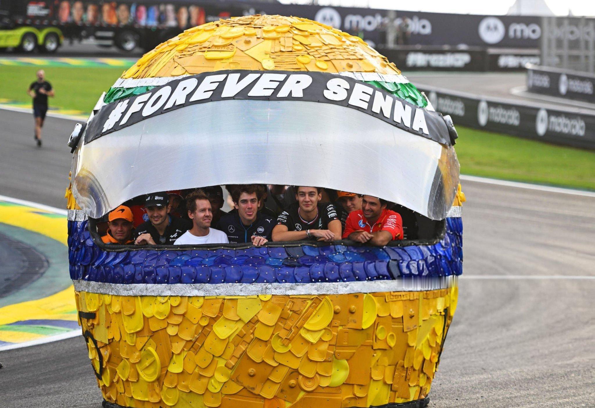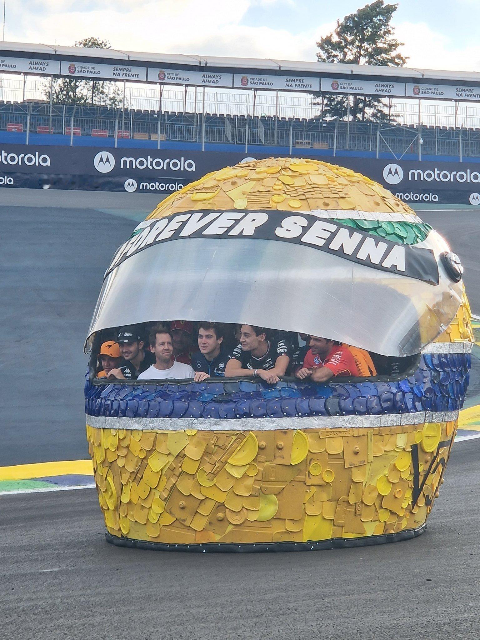 维特尔周四在英特拉各斯赛道组织了一个纪念塞纳的活动,一个巨大的塞纳头盔放置在“塞纳S弯”出弯位置,这个头盔是通过回收材料制作而成的。