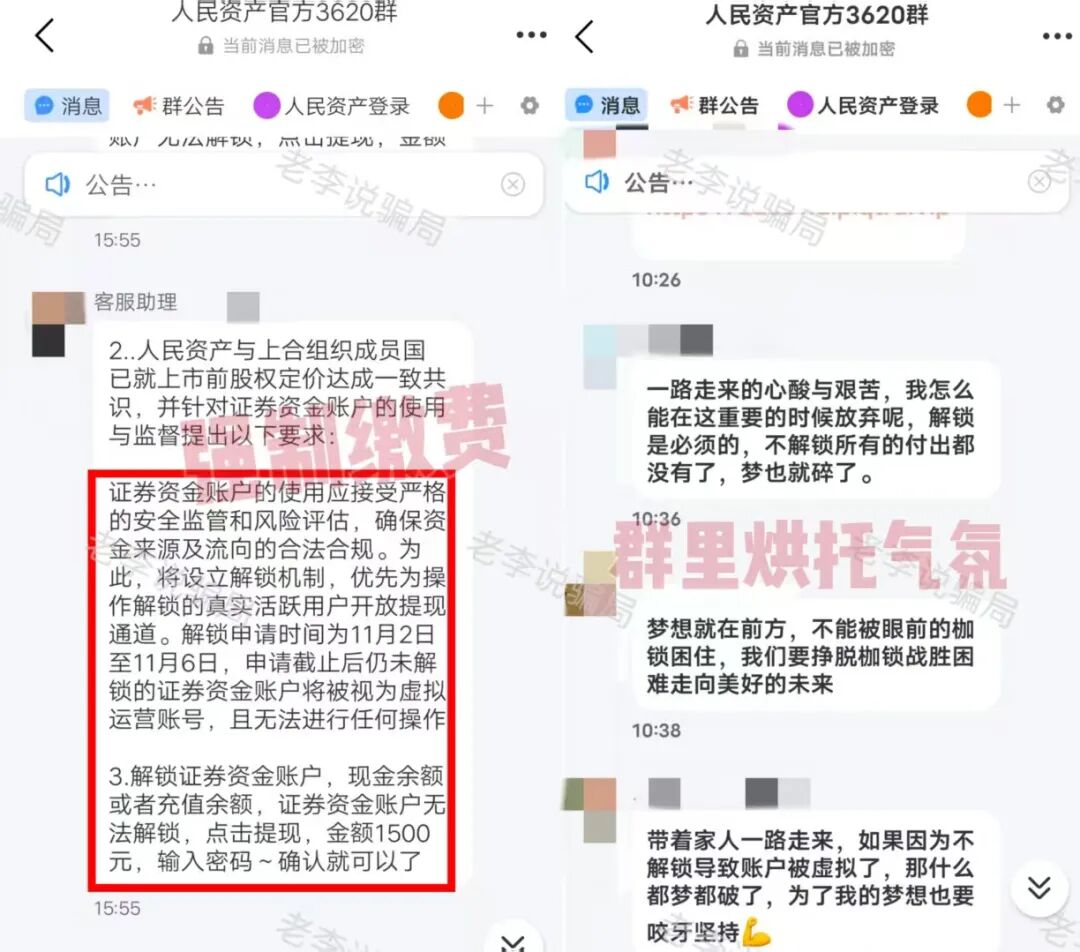 这个项目最近开启了新一轮收割。谎称即将提现要求参与者缴纳1500元用于解锁通道,否则将无法提现。为了增加紧迫感,群内不断有人怂恿,营造不交钱就会“功亏一篑”的假象,致使参与者在短时间内失去理性和判断能力,在“不甘心”的驱动下继续投入。而这,很可能是平台跑路前的最后一笔收割。