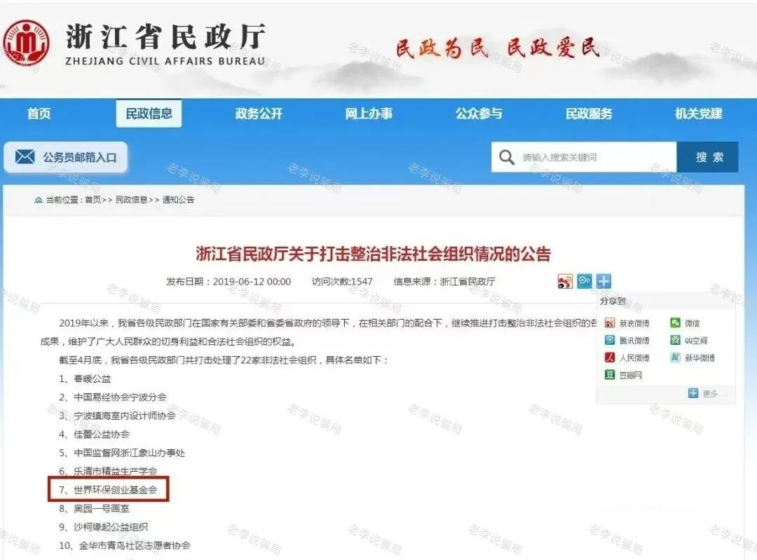 2019年,浙江省民政厅已经将发行方“世界环保创业基金会”定性为非法组织。