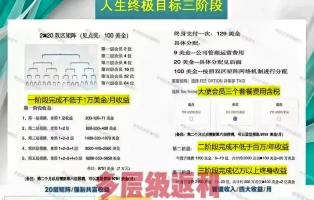 核心产品为一款加密货币,要求用户缴纳129美元获得参与资格,通过“1-20层强制矩阵”和推荐关系形成金字塔层级,收益主要来自拉新,根据推荐人数发放见点奖。
