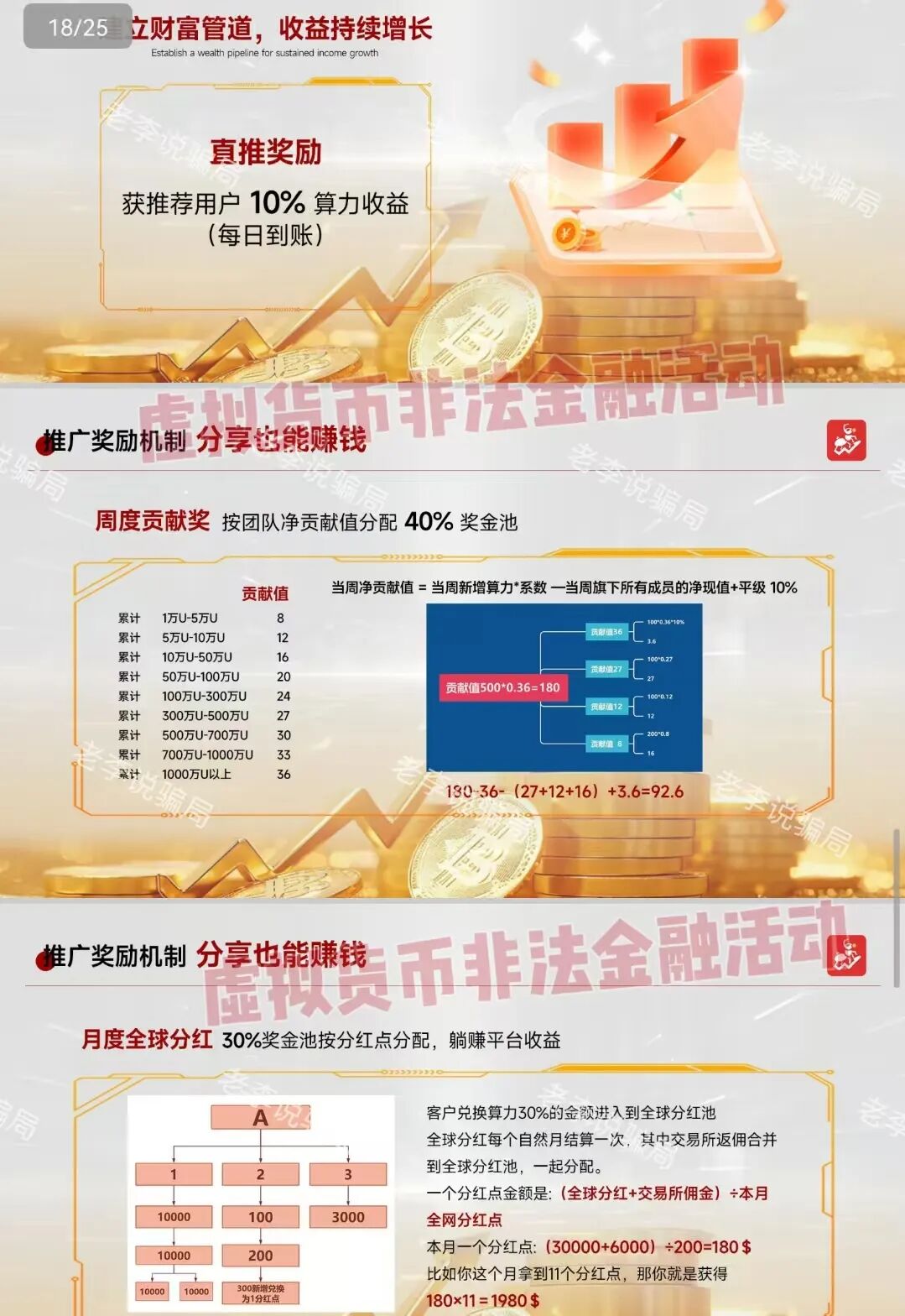 号称AI量化炒作虚拟资产,通过兑换算力参与平台结算,宣称40%~80%年化收益,远远超出市场合理水平。其设置的直推返利、团队贡献奖、全球分红等多层级推广奖励机制,明显为了吸纳新人入金填补旧人收益,带有典型庞氏骗局色彩。根据我国相关规定,虚拟货币代币发行融资和交易炒作相关交易均不受法律保护,属非法金融活动。资金流向缺乏监管,不仅存在平台突然跑路的巨大风险,所谓“智能交易、稳健盈利”的承诺也根本无法兑现,一旦参与,投资者很可能面临血本无归的结局,后续维权难度极大。