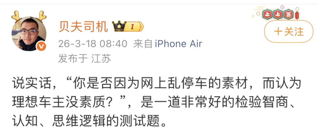 对此,理想前员工贝夫司机也表示,说实话,「你是否因为网上乱停车的素材,而认为理想车主没素质?」,是一道非常好的检验智商、认知、思维逻辑的测试题。
