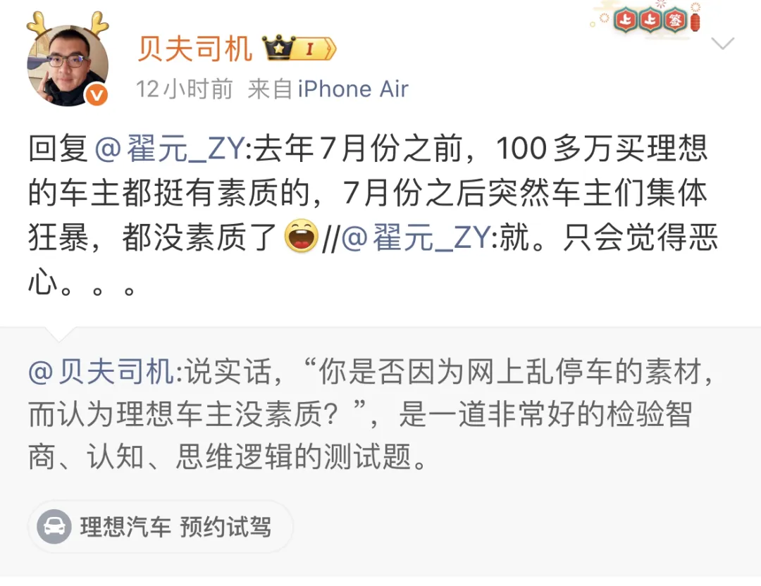 也有网友打趣称「去年7月份之前,100多万买理想的车主都挺有素质的,7月份之后突然车主们集体狂暴,都没素质了」