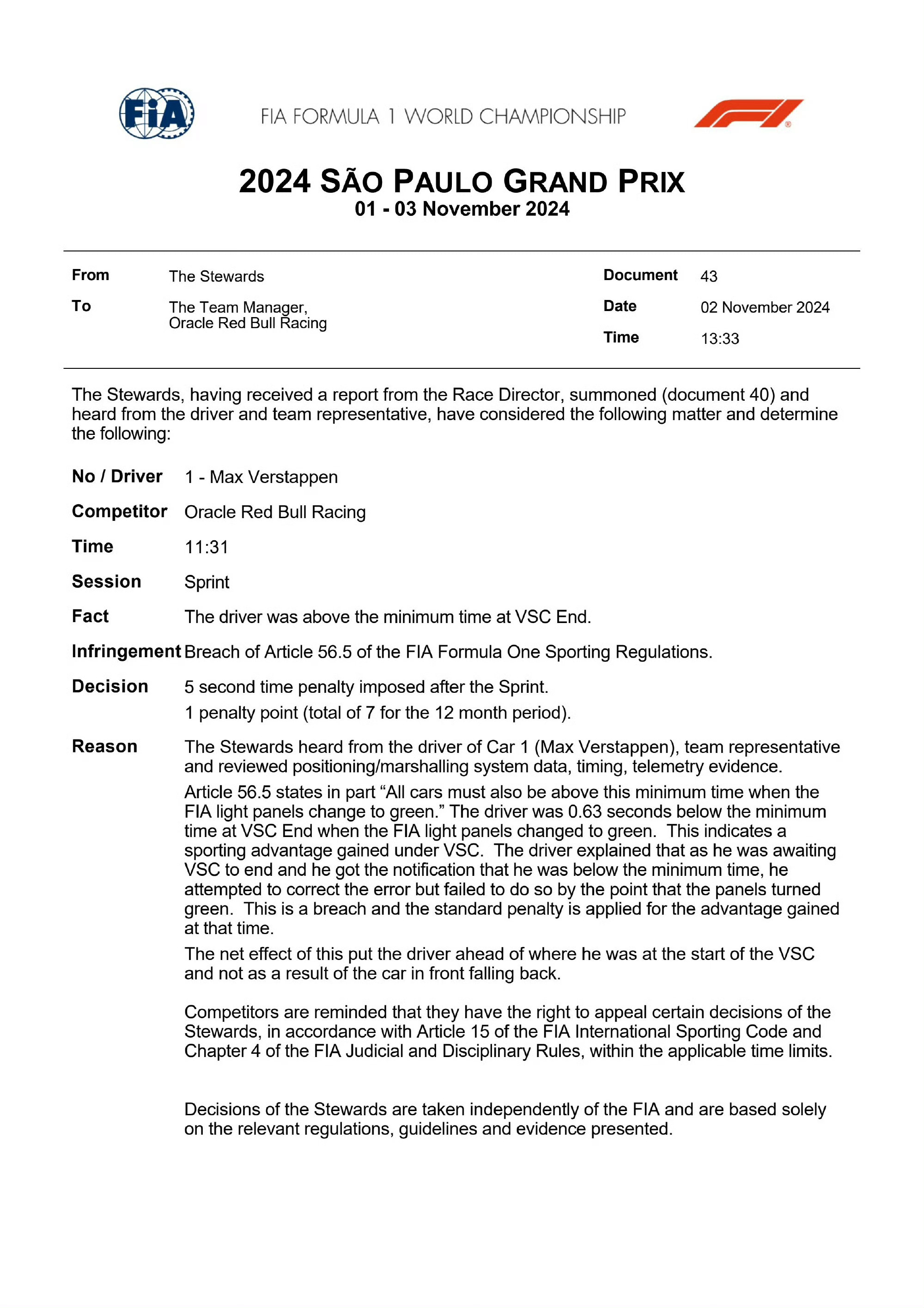 维斯塔潘由于VSC超速,被罚时5秒,冲刺赛成绩跌至第四位,勒克莱尔取得第三。