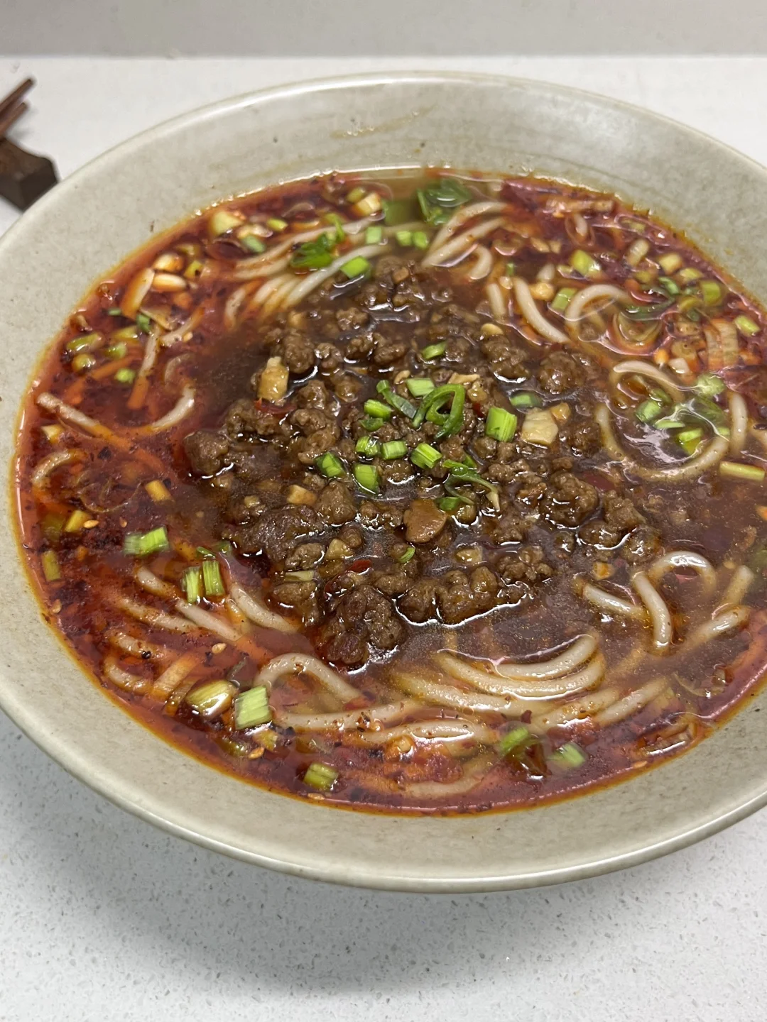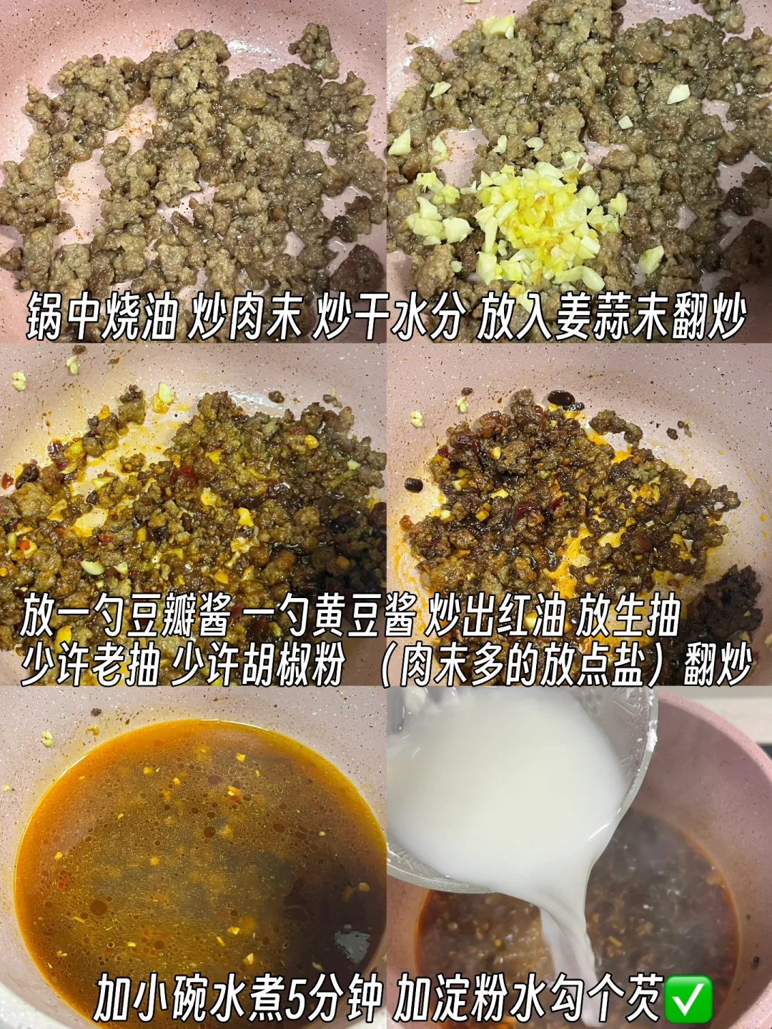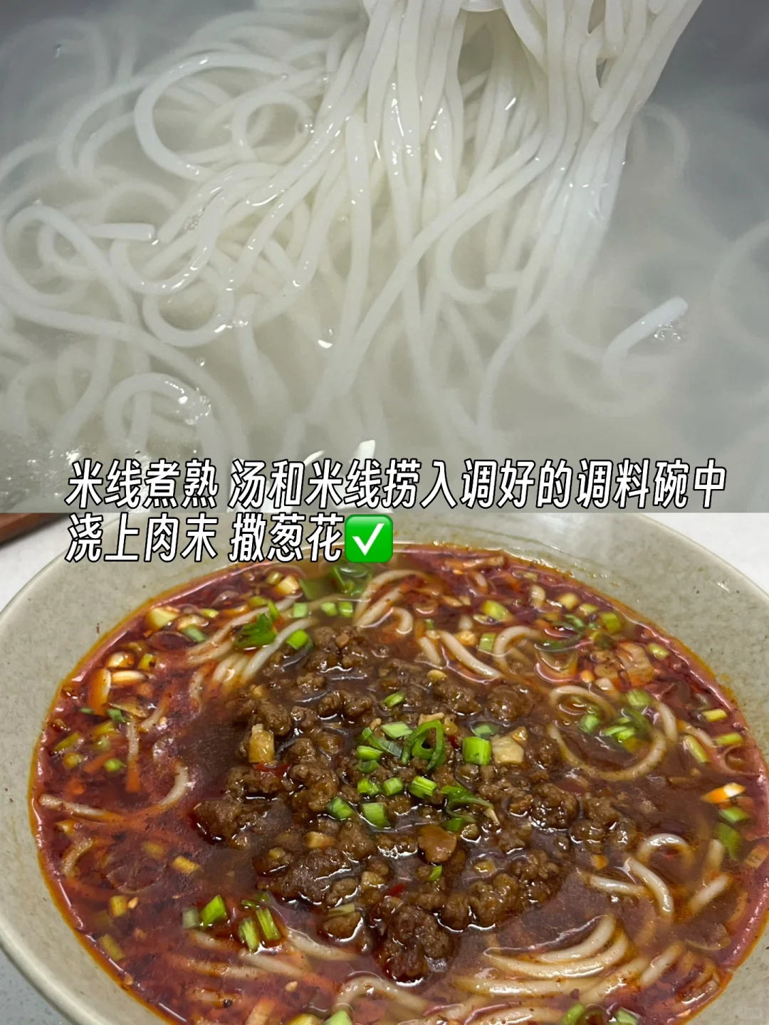1️⃣锅中烧油,肉末炒干水分,放入姜蒜末翻炒,加一勺豆瓣酱、一勺黄豆酱炒出红油 2️⃣加生抽、老抽翻炒(肉末多的可以放点盐)加小碗水煮5分钟,放淀粉水勾个芡 3️⃣调汤底㊙️:碗中放葱花、蒜末、一小勺猪油、少许盐、花椒面、胡椒粉、榨菜、辣椒油、生抽、醋、香油 4️⃣米线煮熟,面汤和米线捞入调料碗中,浇上肉末,撒葱花✅