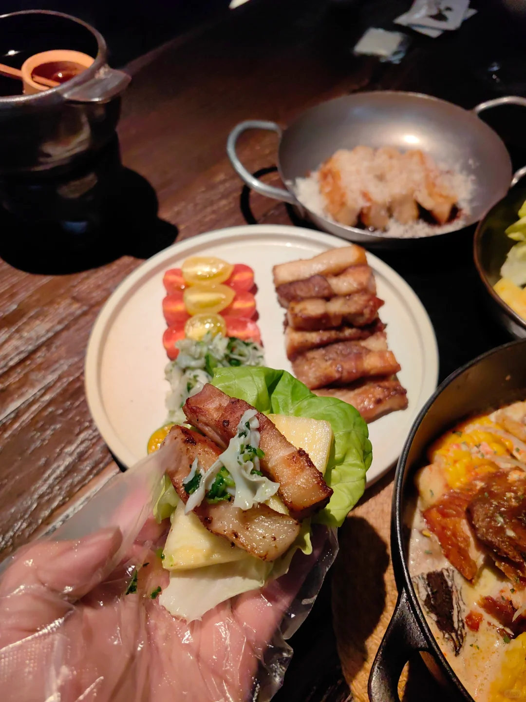 生菜裹着各式配菜还有泡菜,配菜里面居然还有水果,小清新版的下饭菜。整个就是又好看又好吃!