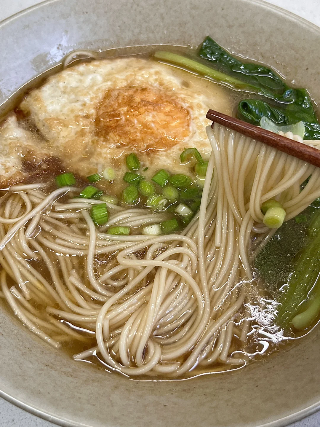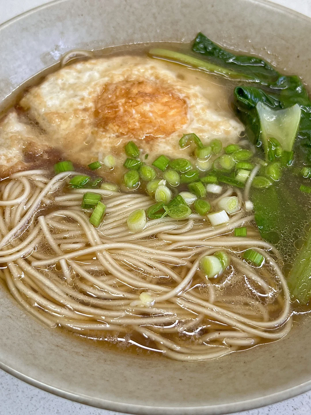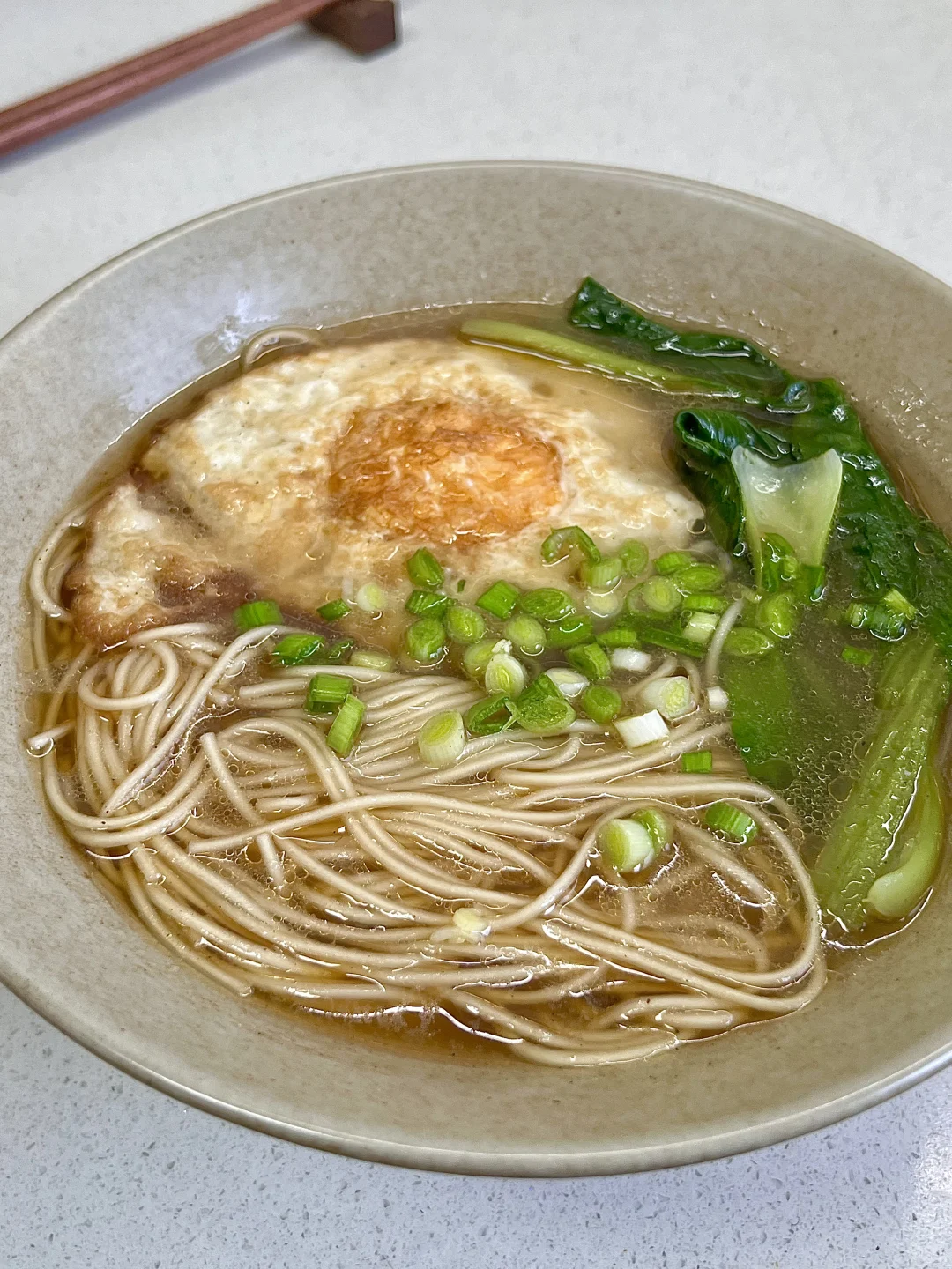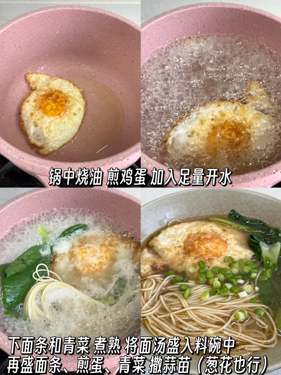 1️⃣碗中放两勺生抽、一勺醋、一勺香油、少许盐、少许糖、少许鸡精、少许胡椒粉 2️⃣锅中烧油,煎鸡蛋,加入足量开水,下面条和青菜煮熟 3️⃣将面汤先盛入料碗中,再捞面条、煎蛋、青菜,撒蒜苗(葱花也行)✅