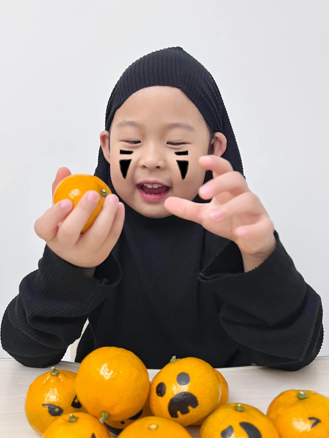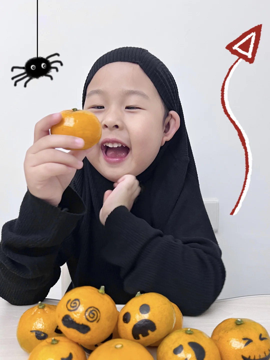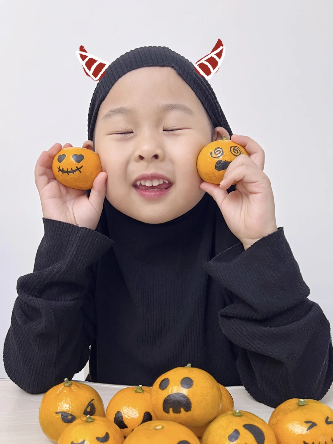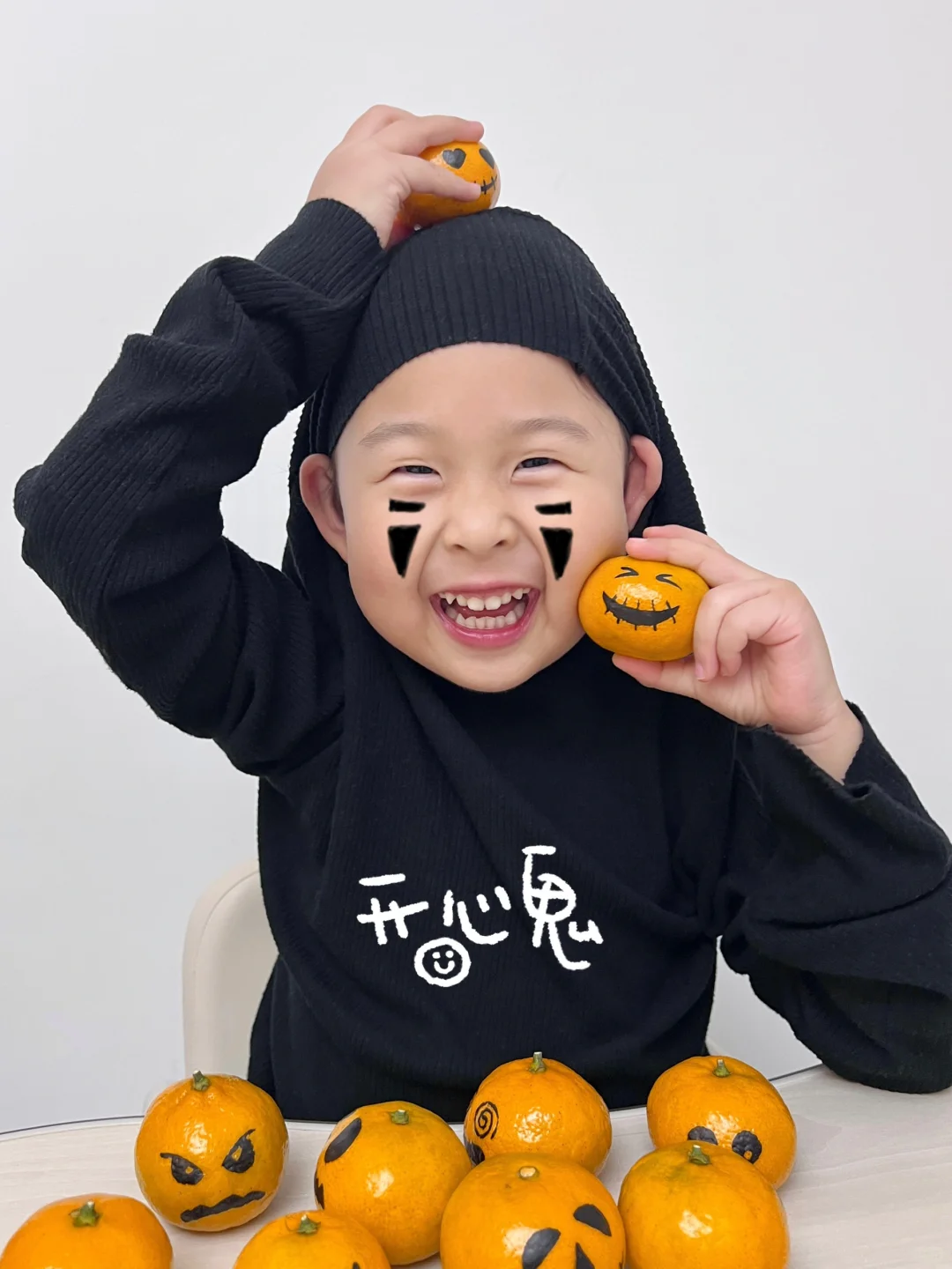 万圣节快到了!氛围搞起来👻👻👻 今天教大家0💰成本宅家拍万圣节可爱鬼,一起给娃拍搞怪的九宫格大头照吧! 🎃 准备几个橘子 黑色丙烯笔或记号笔 妈妈的黑毛衣或爸爸的黑T恤 🎃 橘子画上表情 找一面白墙,随便什么姿势都很有趣呢~ 🎃 调图没有统一规范,根据自己拍出的光线调整,再加上万圣节贴纸就👌啦~