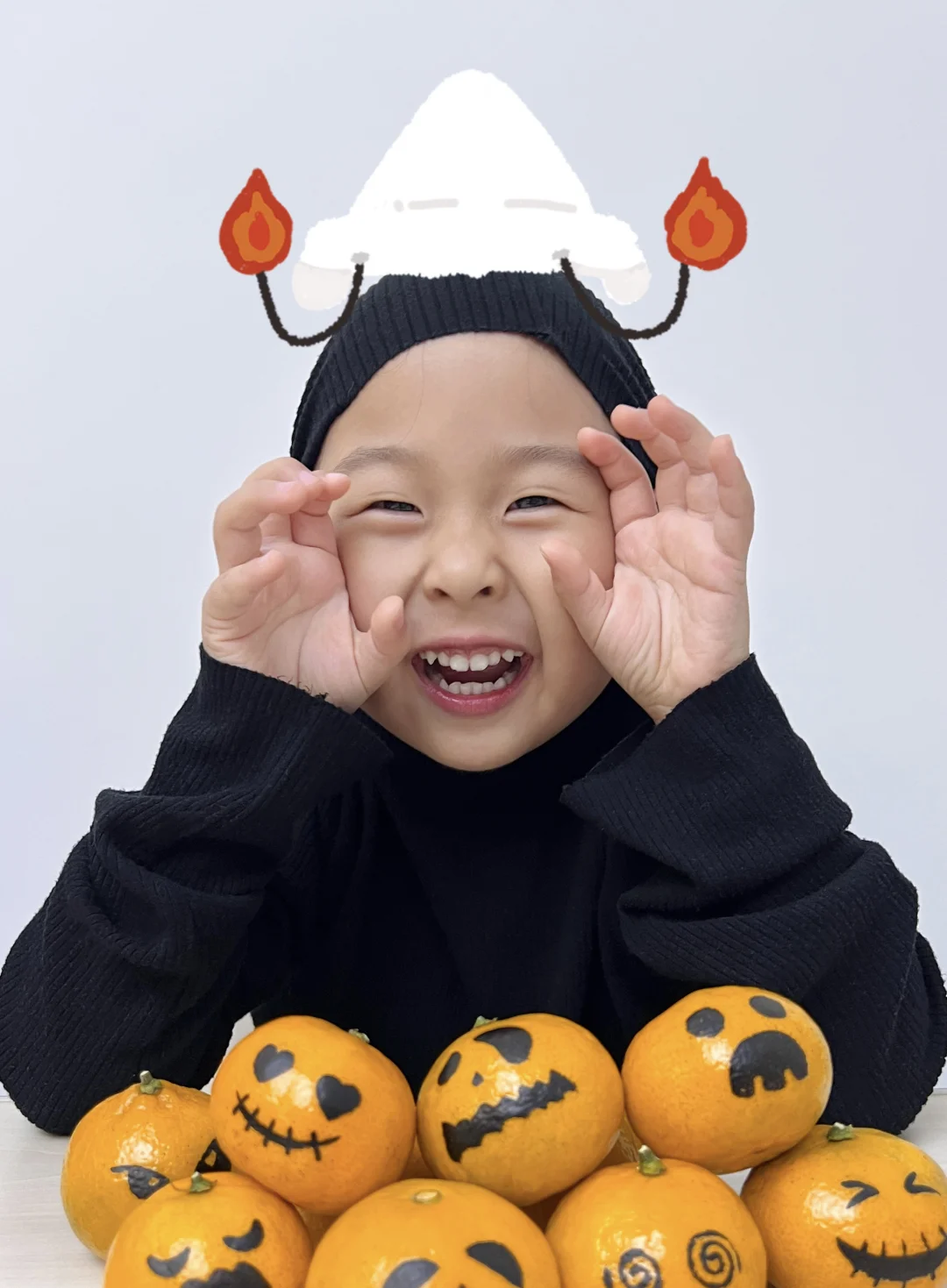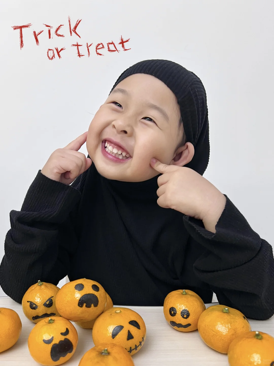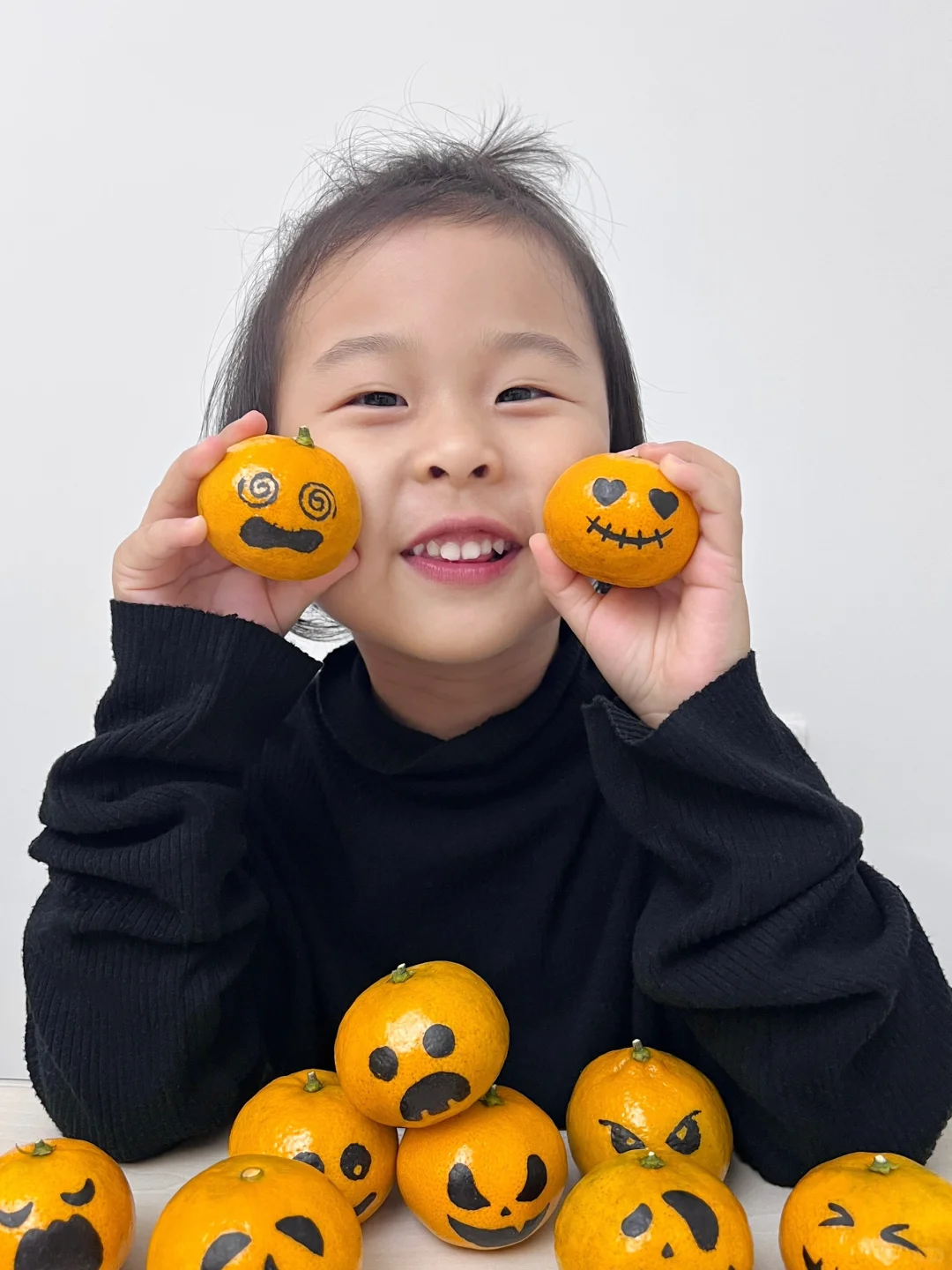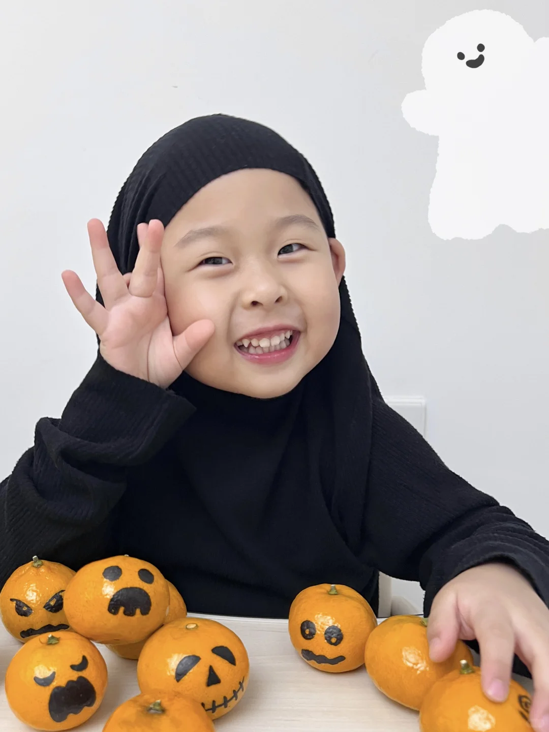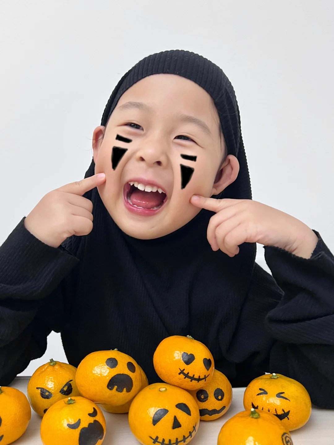 万圣节快到了!氛围搞起来👻👻👻 今天教大家0💰成本宅家拍万圣节可爱鬼,一起给娃拍搞怪的九宫格大头照吧! 🎃 准备几个橘子 黑色丙烯笔或记号笔 妈妈的黑毛衣或爸爸的黑T恤 🎃 橘子画上表情 找一面白墙,随便什么姿势都很有趣呢~ 🎃 调图没有统一规范,根据自己拍出的光线调整,再加上万圣节贴纸就👌啦~