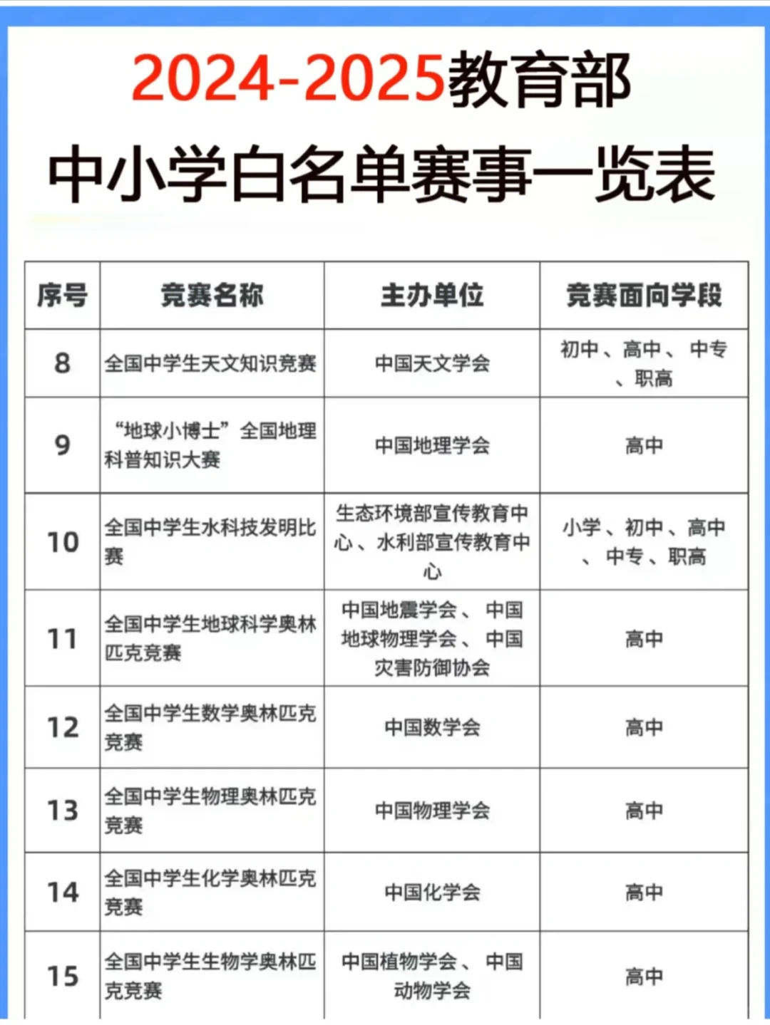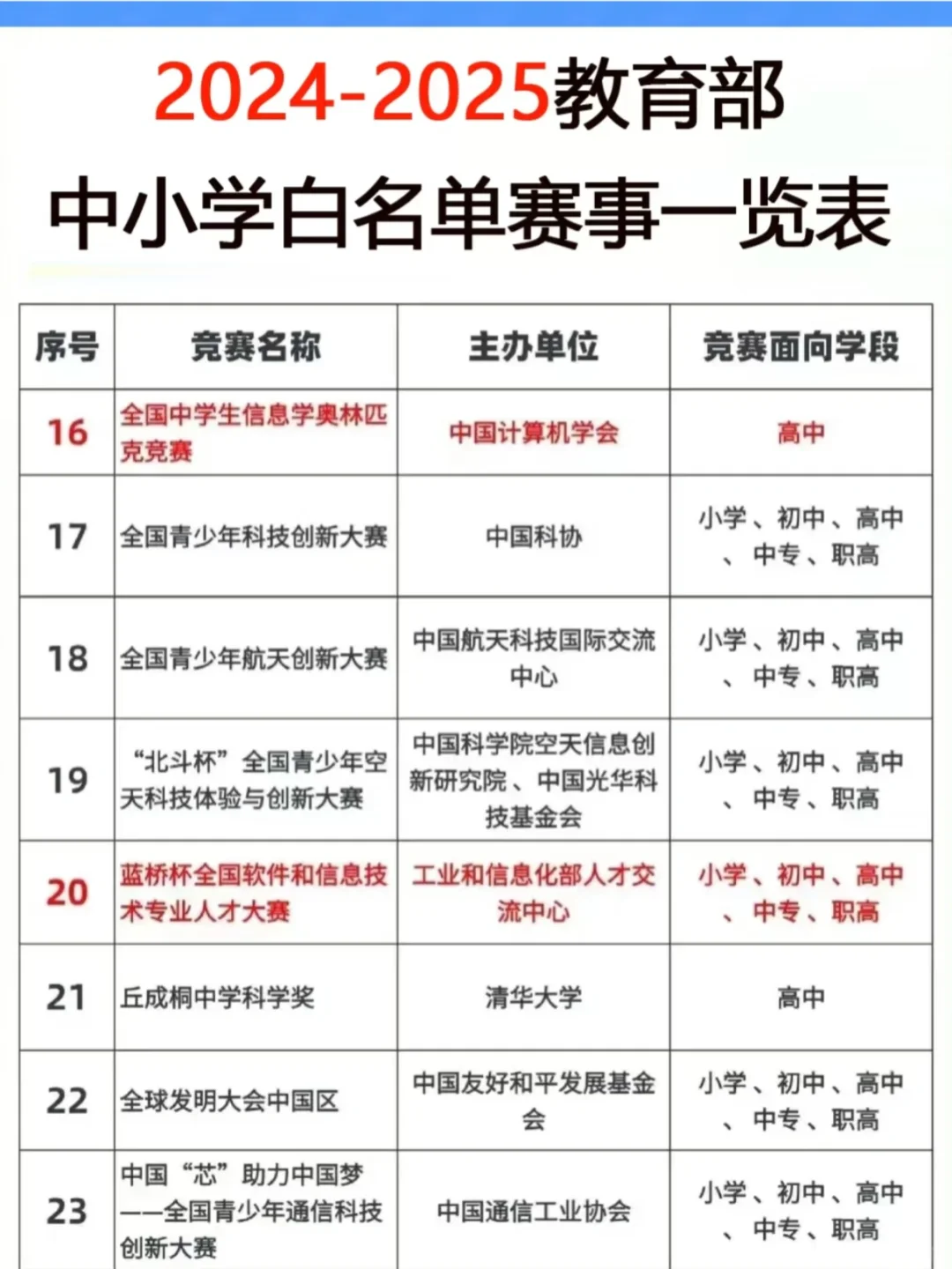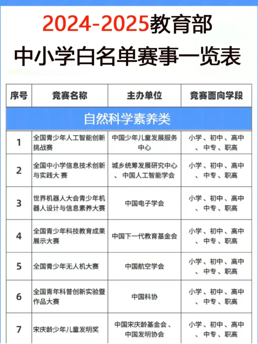 项目很多,包括机器人、建模、编程C++都算。虽然白名单里一些🥇可以💰,但也有一部分是含金量很高的。譬如青创、雏鹰一二等奖还是很厉害的,如果为了升学,这些奖最好四年级就要拿到,所以卷的程度可想而知。如果能拿到高端科创市里的奖,那在小s初的时候就是王炸。