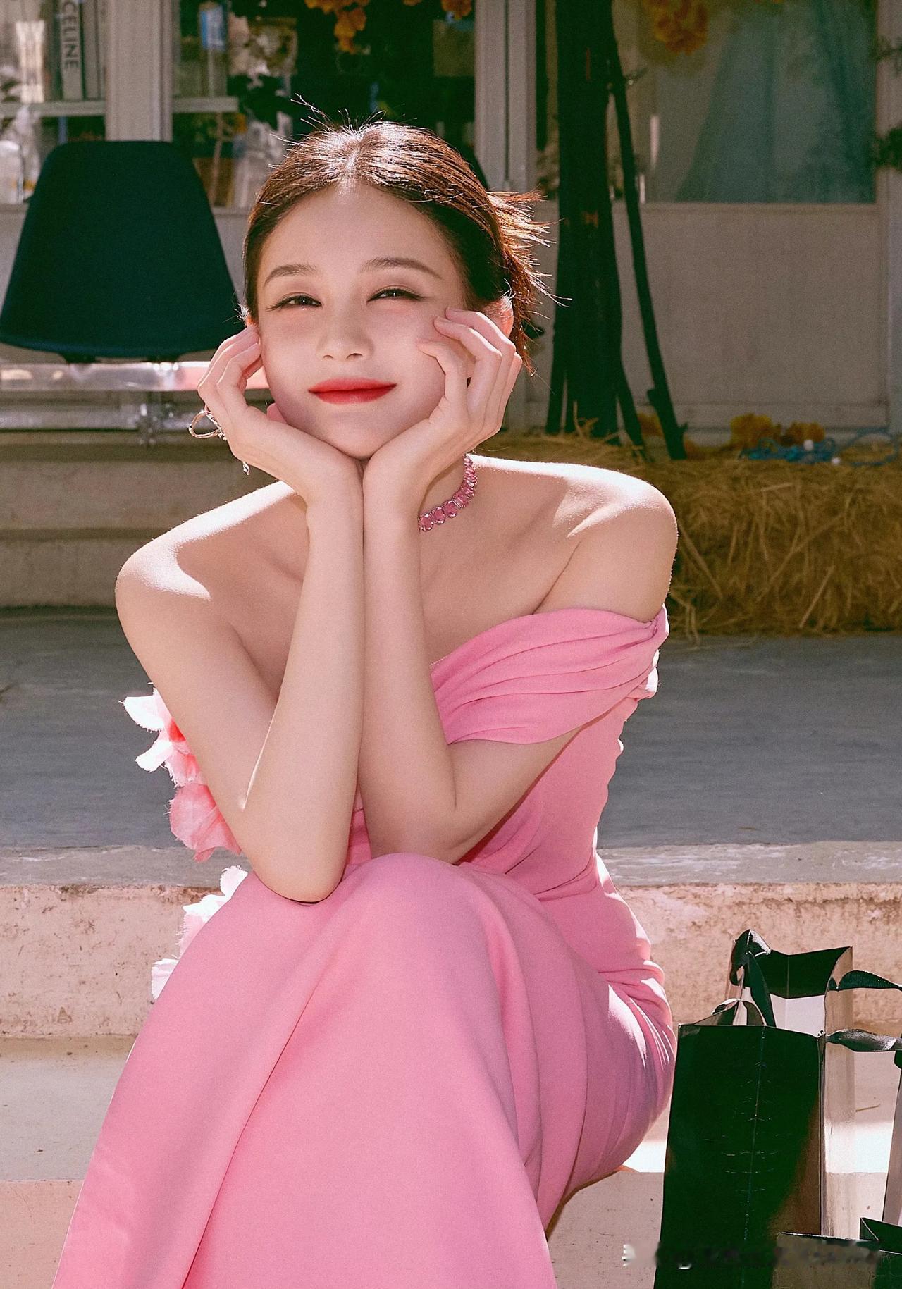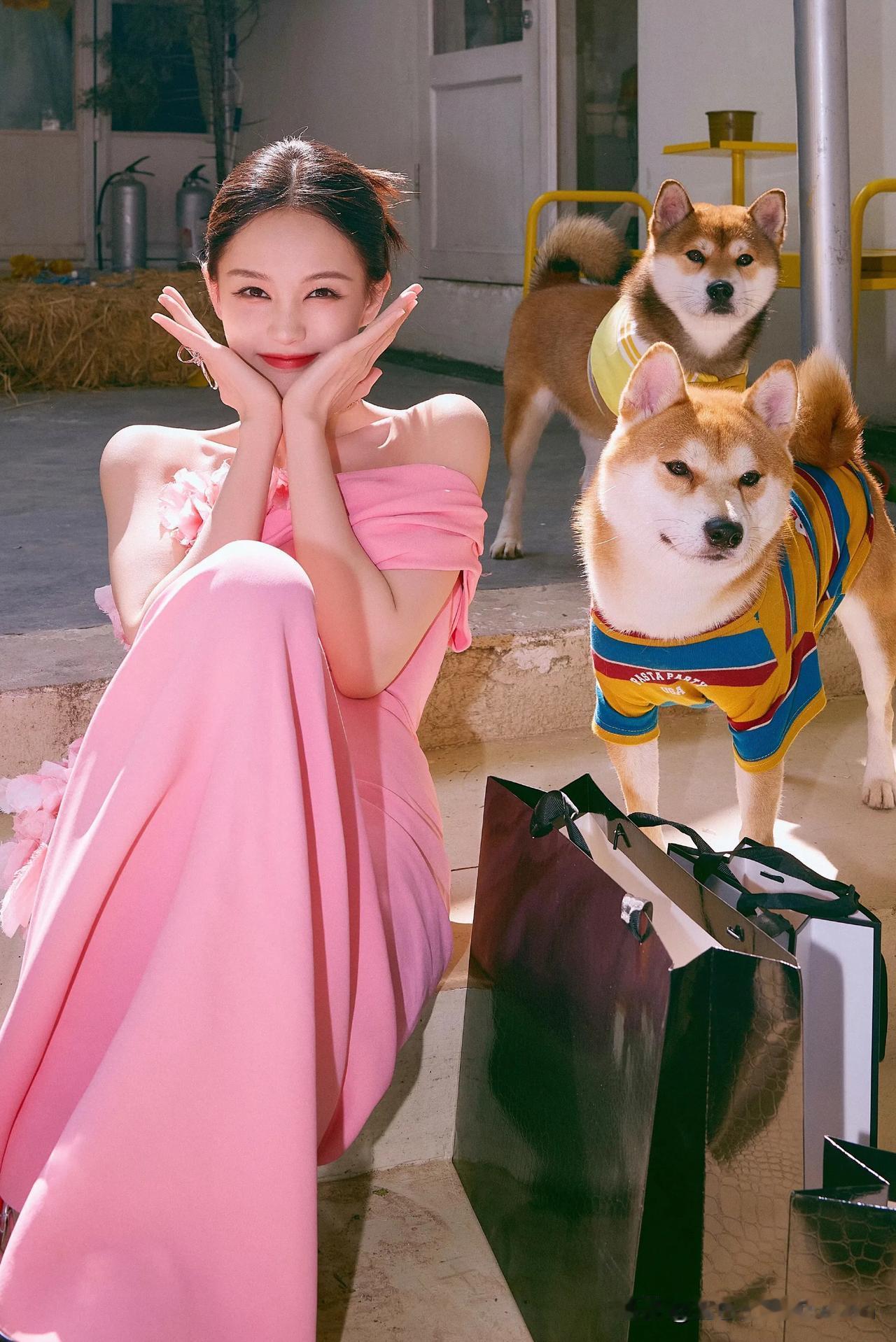 李一桐粉衣佳人笑语中,犬伴相伴笑如花