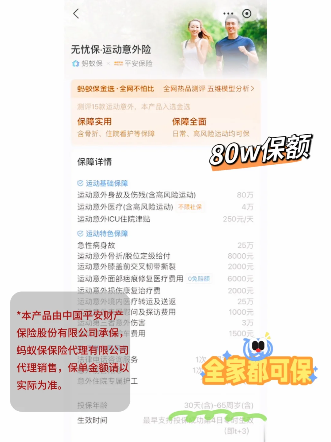 一款全家通用的运动意外险,下至满月小儿,上至65周岁,都可以投保。