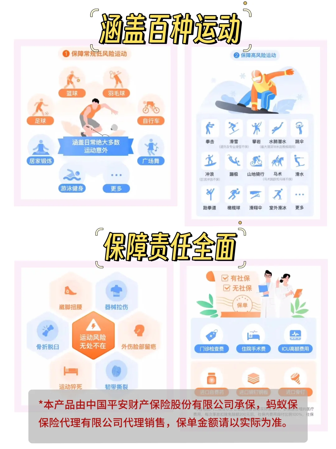 ✅特色服务保障,除了基础的意外医疗保障外,还有运动特色责任如骨折、韧带撕裂、面部疤痕修复、运动康复等也可以保障,直接定级给付👌
