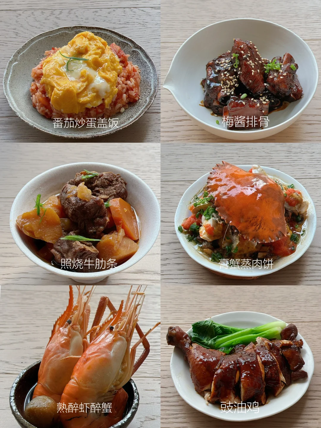 - 整理了一些好吃的料理合集 提供给大家一些做饭灵感🖐🏻 ▫️番茄炒蛋盖饭🍅🍳 ▫️梅酱排骨🫒🍖 ▫️照烧牛肋条🥩 ▫️膏蟹蒸肉饼🦀 ▫️熟醉虾醉蟹🦐 ▫️豉油鸡🍗 好好吃饭 好好爱自己呀 珍惜自己每一餐的福报 生活才能细水长流🍂
