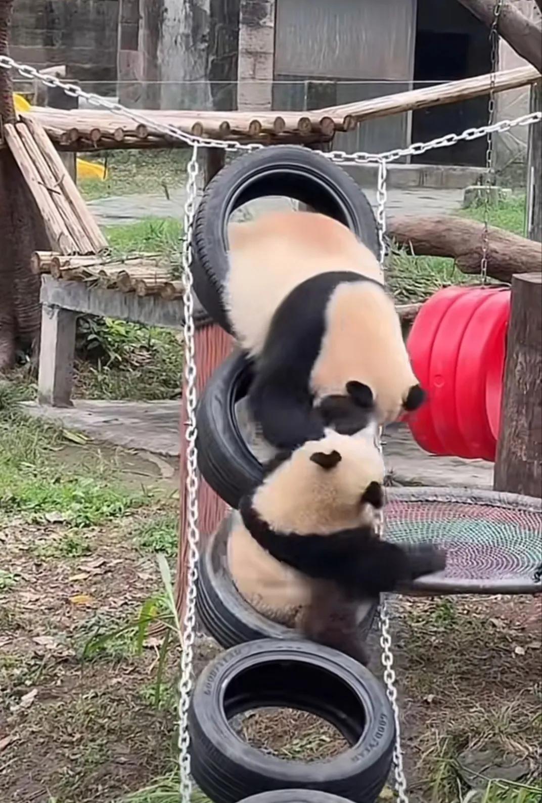 莽小五:新玩具上没有母子,莽妞妞来决战吧! 妈妈莽仔还是忍了,如果赏好大儿一个飞起,莽小五估计又要摔屁墩儿了! 莽小五是越挨打越要迎头直上啊,它是挺勇的,难道就不担心它的母亲大人发熊威啊!#小毛孩长能耐了# #熊猫有趣分享# #关爱大熊猫#