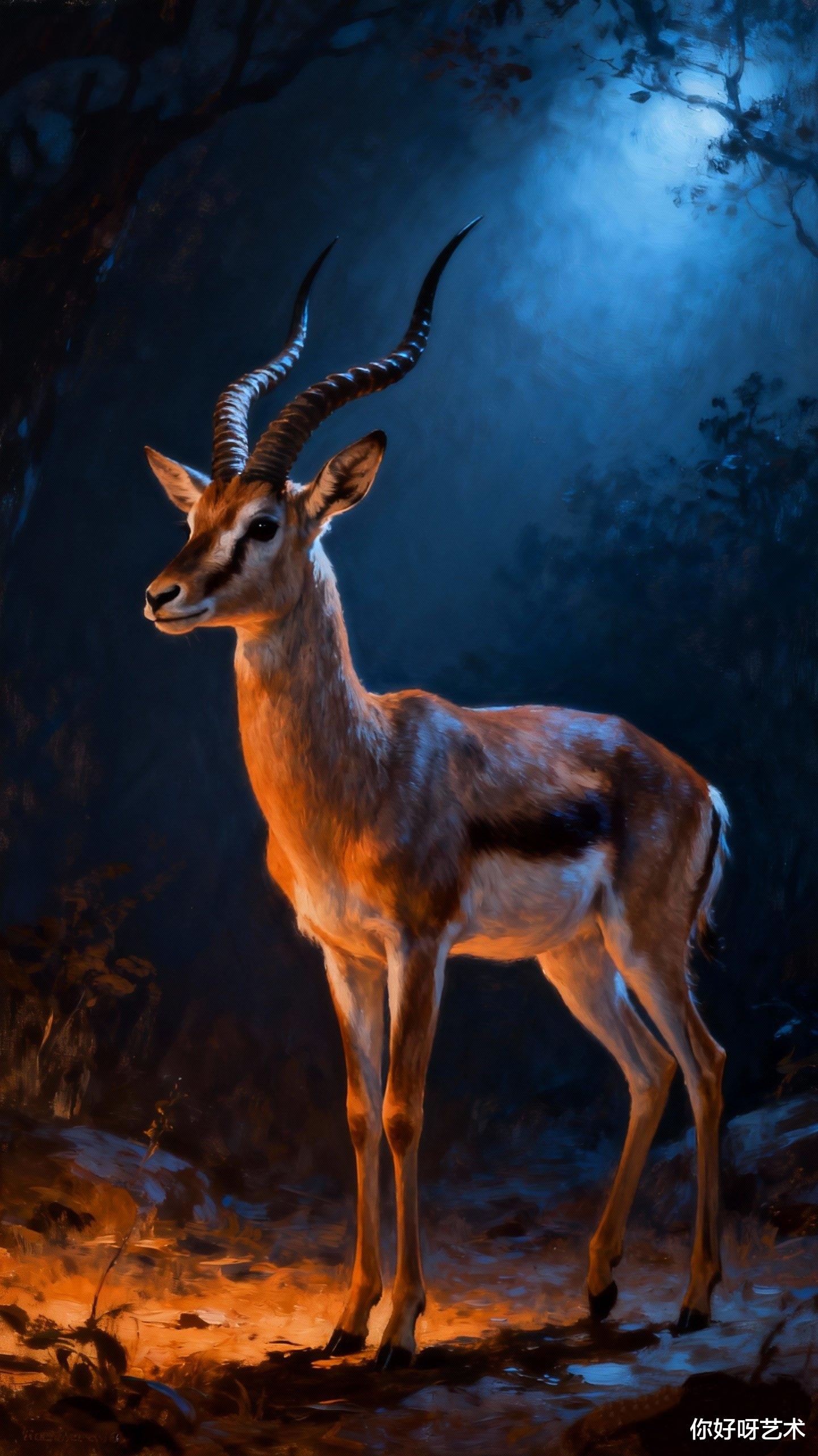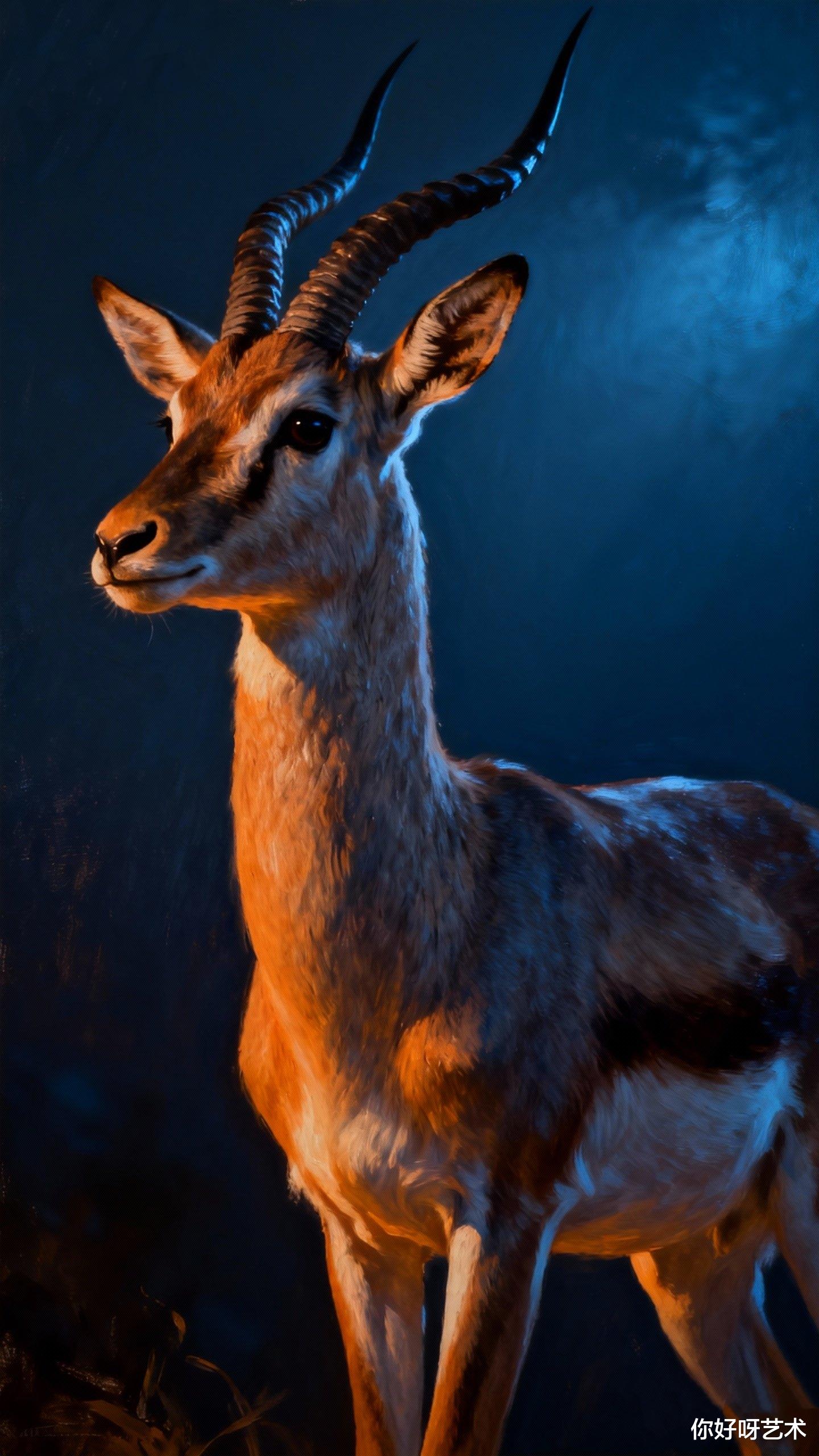 画布上的轮廓在油彩里渐渐清晰。我画的不是她站在领奖台的模样,是她在演唱会舞台中央的瞬间:亮片缀满的演出服用银白与淡粉层层叠加,裙摆处用细笔勾勒出流动的线条,像她旋转时扬起的光带,每一片亮片都用钛白点出细碎的反光,仿佛舞台上的聚光灯都落在她身上。她的角微微弯曲,我用淡金与米白调出温润的光泽,角尖处晕了点浅粉,像她笑起来时眼里闪的光,柔和却不刺眼。她的前蹄轻轻踮起,呈出跳舞的姿态,我用浅灰在蹄尖下画了道淡淡的阴影,衬得这个动作像要飞起来一样轻盈,却又带着稳稳的力量——就像她唱歌时,既能飙出清亮的高音,又能唱出抚慰人心的温柔。