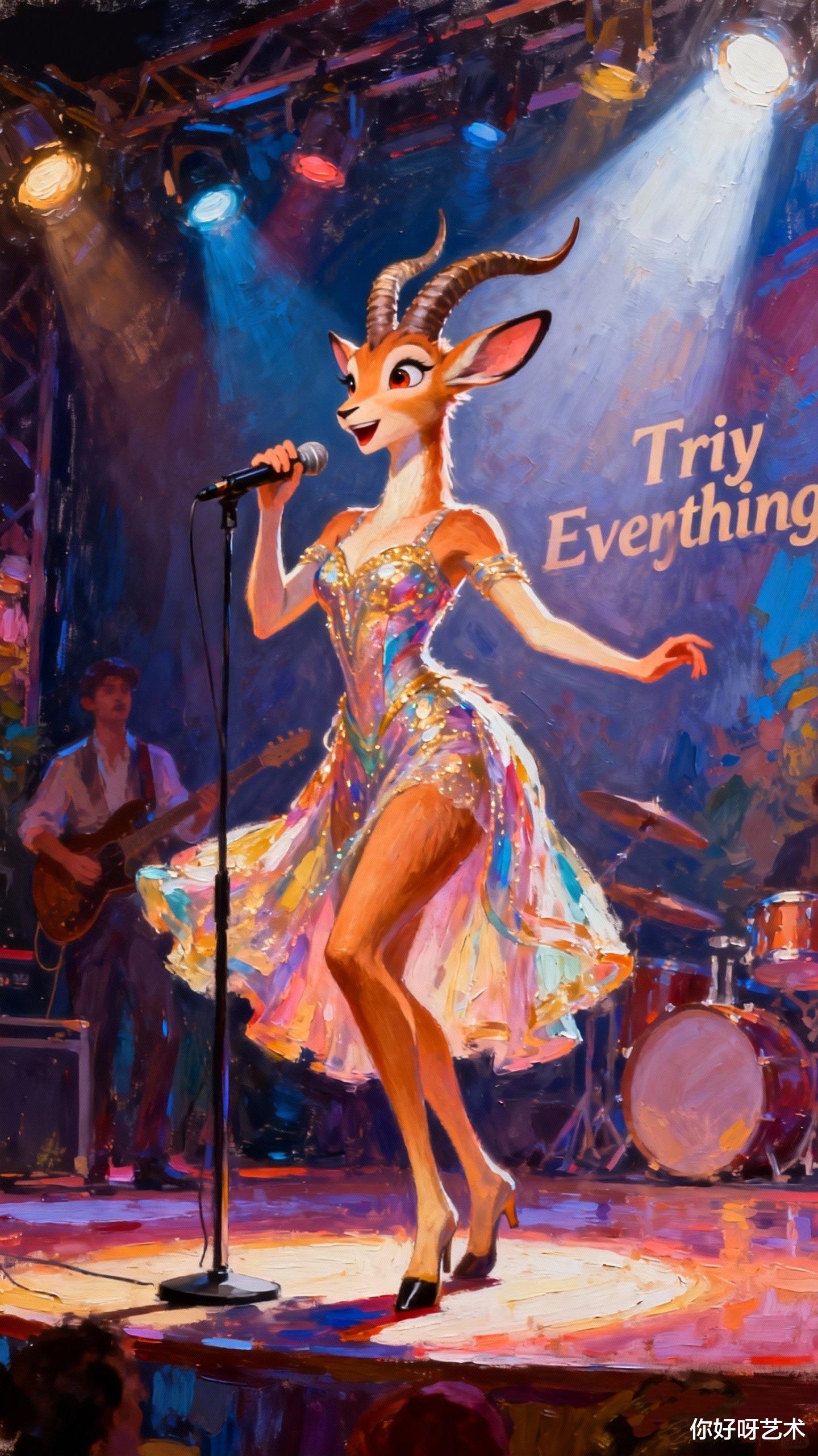 油彩干透的那天,阳光透过画室的窗户落在画布上。夏奇羊演出服上的银白在光里泛着闪,连背景里的淡紫都多了点灵动。我忽然明白,我画的从来不是一只“超级明星”瞪羚,是藏在油彩里的温柔力量——它不是舞台上的璀璨光芒,是有人把自己活成了一束光,既能用歌声点燃别人的勇气,又能用善良温暖别人的心房,就像夏奇羊,既能在舞台上唱跳俱佳,也能在生活里用爱传递“Try Everything”的信念。