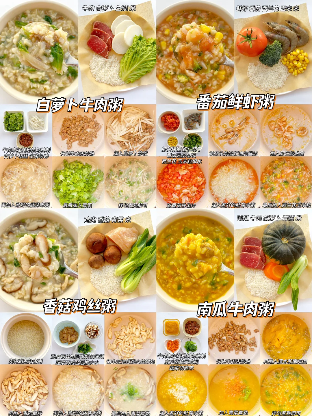 ☁️天气转凉的早餐吃什么呢,不如安排一碗热乎乎的营养粥吧,一碗下肚整个人都暖暖的☀️。今天一次分享12款,每种都是营养搭配,简单好做,妈妈们快点给宝宝安排起来吧✅。 ~ 🔸生菜瘦肉粥 🔸番茄鲜虾粥 🔸干贝海鲜粥 🔸番茄牛肉粥 🔸肉末山药粥 🔸芋头排骨粥 🔸经典海鲜粥 🔸火腿蛋花粥 🔸南瓜红枣粥 🔸香菇鸡丝粥 🔸萝卜牛肉粥 🔸南瓜牛肉粥