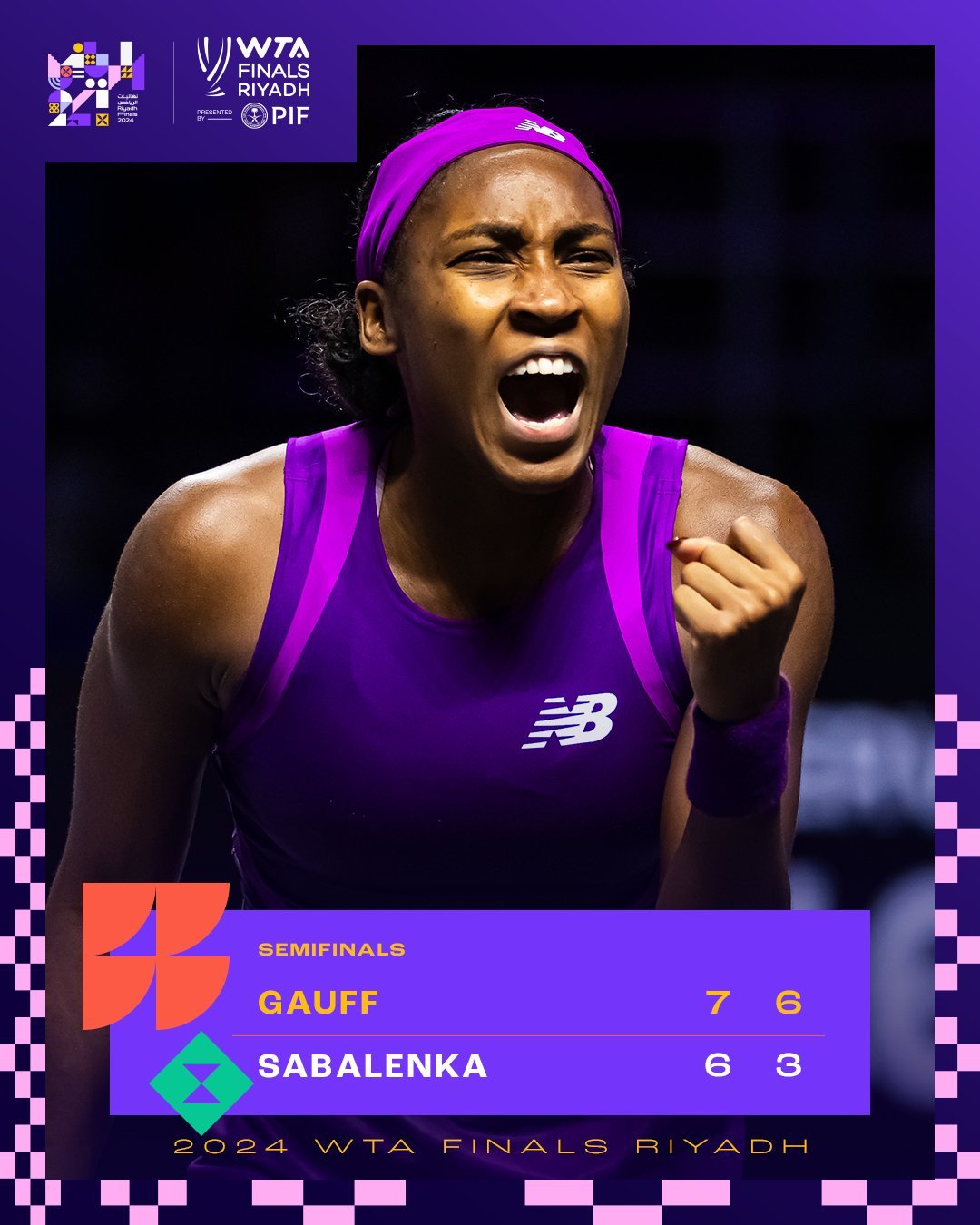 高芙7-6(4)/6-3击败头号种子萨巴伦卡,也是生涯首次晋级年终赛决赛。今晚在利雅得将产生一位新的年终总决赛冠军。#郑钦文vs高芙#