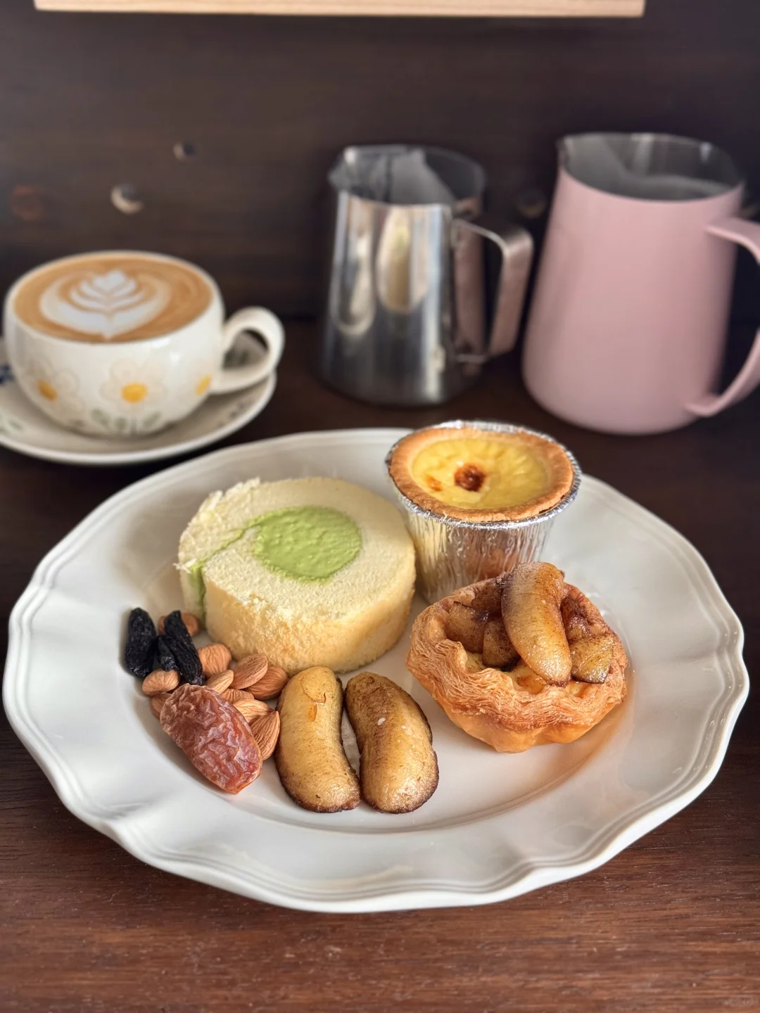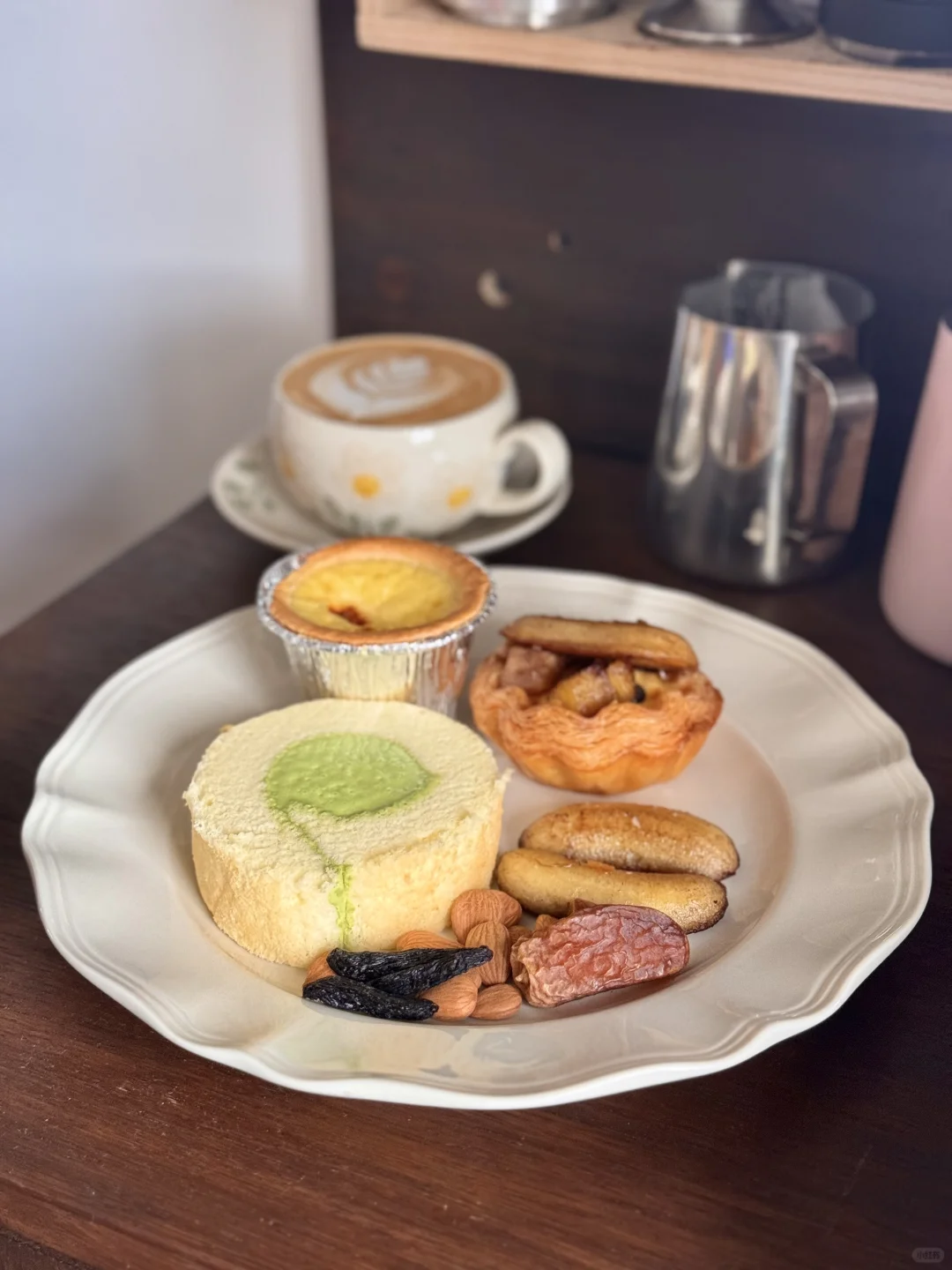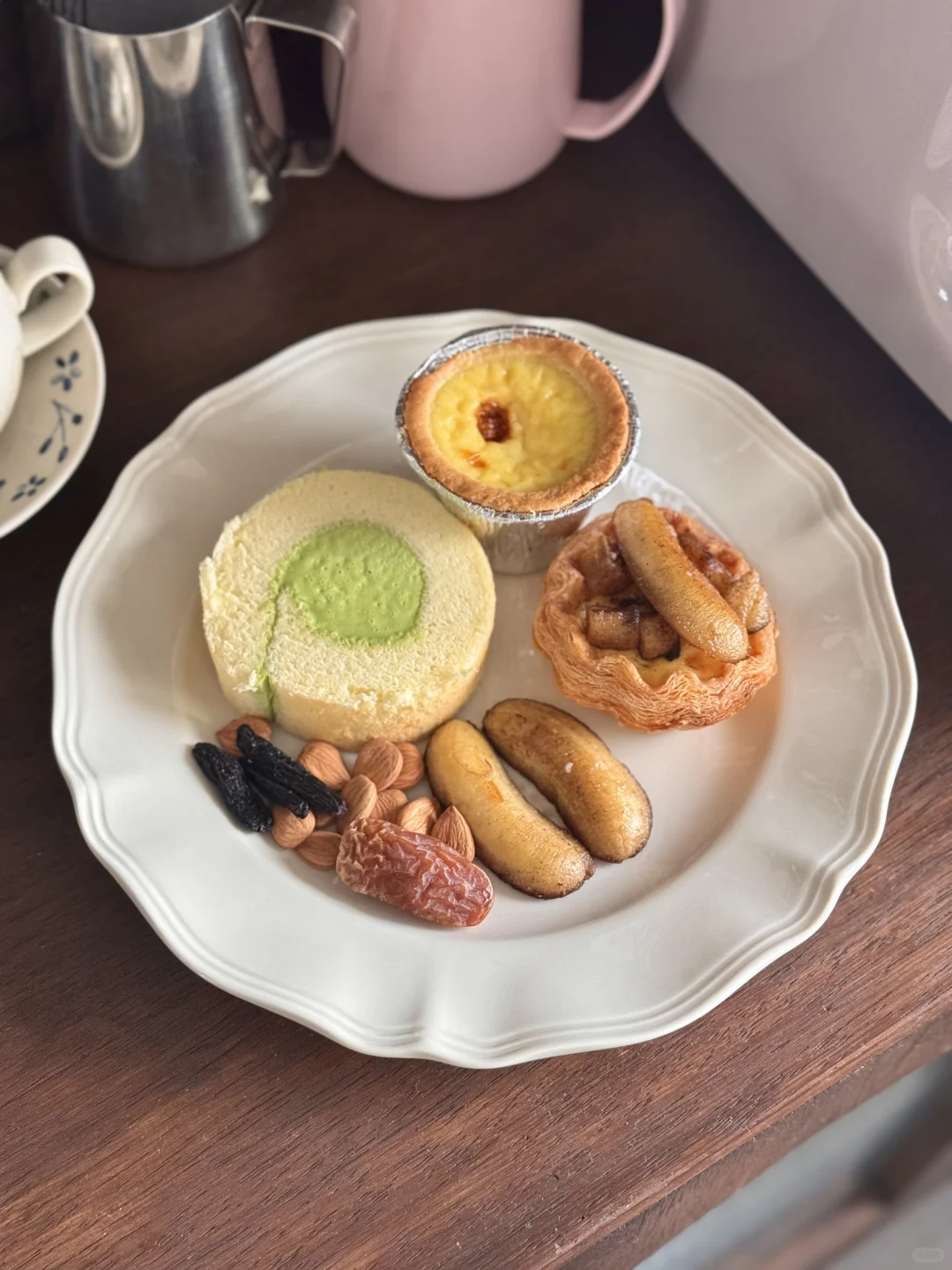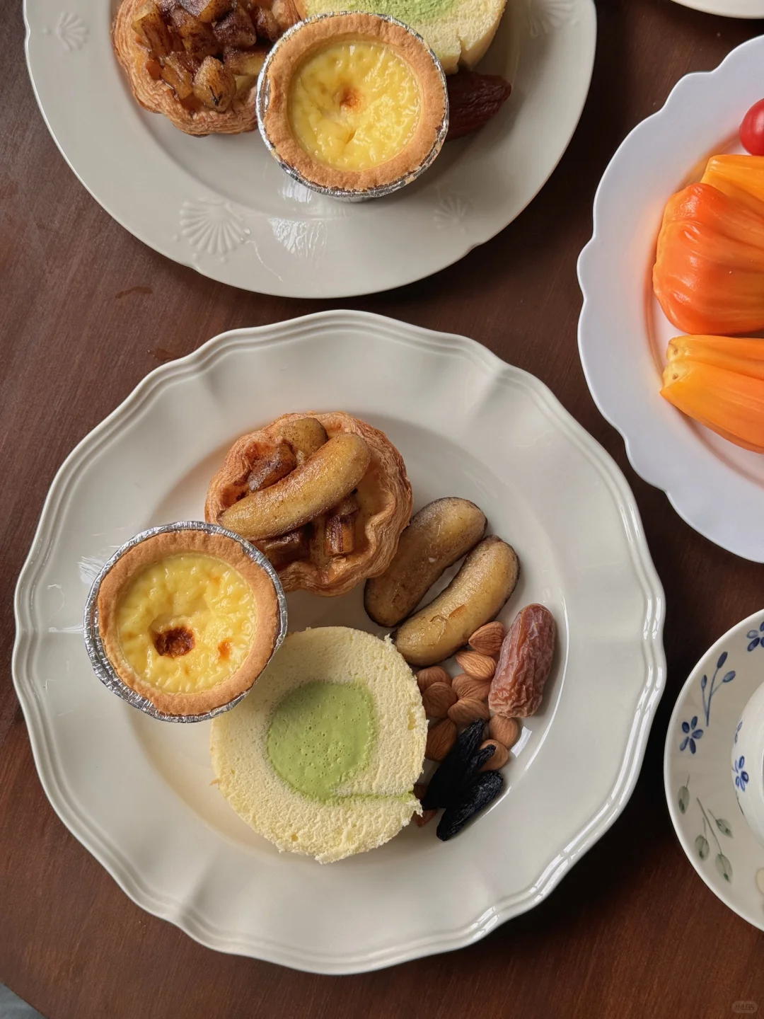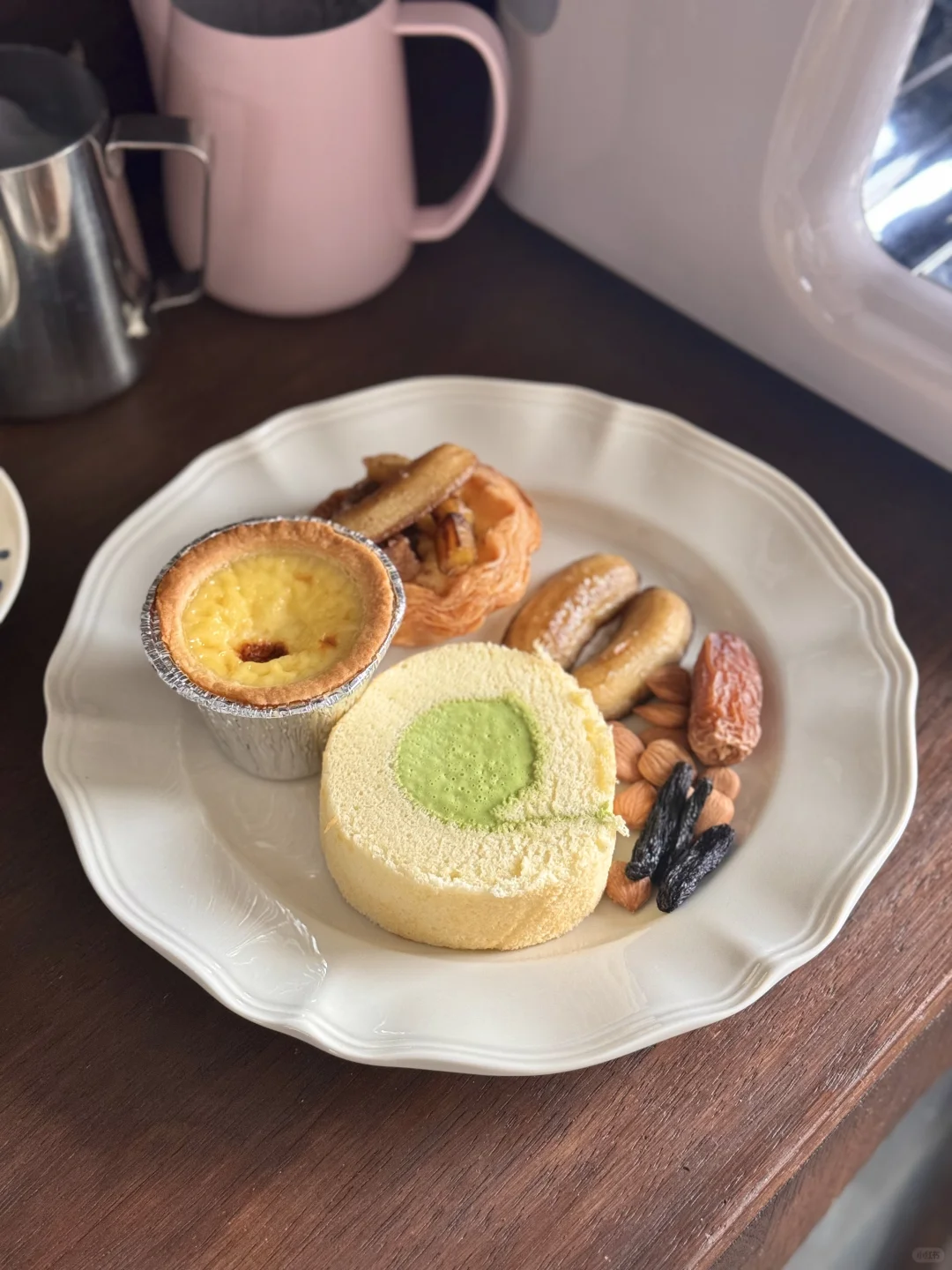 一大早吃甜食一天都会开心~ 抹茶原味蛋糕卷 香蕉肉桂蛋挞 还有德式盘挞 就着齁甜的椰枣和新疆葡萄 早餐甜分爆表啦 不过就着咖啡一起吃,一切都刚刚好