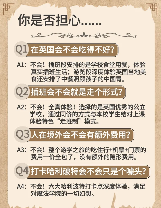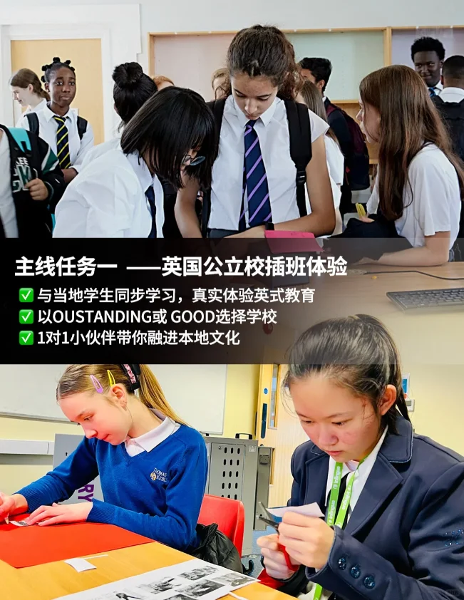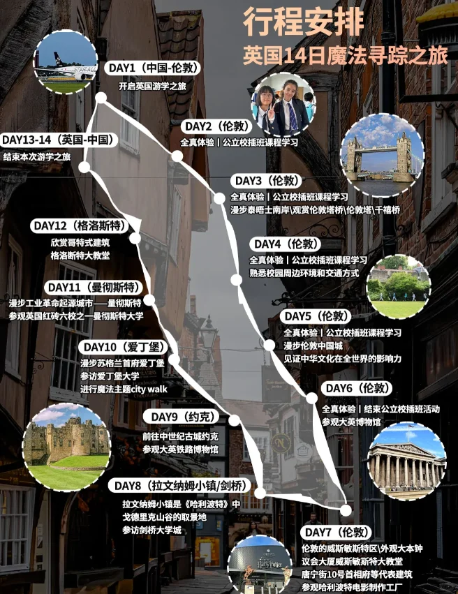 😱太绝了这条游学路线,沉浸插班体验+魔法寻踪之旅 【全真2线-伦敦学校插班生+苏格兰魔法寻踪游学项目🎓】爆满预警!! - 主线任务1⃣,插班体验+名校参访 ✔选择英国教育局评级在Outstanding和Good的英国公立学校,在学期中插班体验当地教育模式,为孩子1对1匹配当地的学伴,体验特色“走班制”。 ✔深度访学牛津大学、剑桥大学、爱丁堡大学、曼彻斯特大学,感受浓郁的学术氛围,在心里埋下梦中情学的种子。 - 主线任务2⃣,city walk+魔法寻踪 ❌不搞噱头,别人在影院观看哈利波特的时候,我们已经在伦敦各个角落漫步,寻找《哈里波特》留下的魔法印记了~ ✔格洛断特大教堂:霍格沃茨学院的走廊 ✔爱丁堡大学:《哈利波特》的诞生地以及小说相关灵感来源 ✔干禧桥:食死徒入侵麻瓜世界的入口 ✔拉文纳姆小镇:哈利出生的地方,一切冒险的起源 ✔肉铺街:对角巷取景地,巫师们聚集购买装备的地方 ✔大英铁路博物馆:你可以找到霍格沃茨号列车的原型 …… 【霍格沃茨入学指南】 ✅年龄:12-16周岁 ✅天数:14天12晚 ✅费用:餐饮+酒店+机票+门票+签证,全包! - 点击【立即咨询】念出咒语急急现形🪄 了解更详细的时间安排➕具体路线➕食宿情况➕费用等信息 还有早鸟价zui高💥-2000的优惠可领取噢! 一次深度游学,可能比课堂更生动、比旅行更深刻 让我们一起畅游英国,来场霍格沃茨的魔法之旅吧~🧚