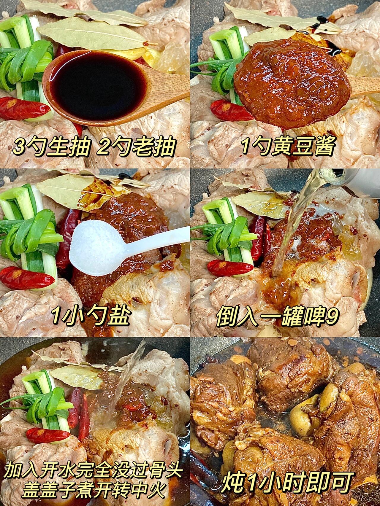 然后,开始调味。加入3勺生抽、2勺老抽、1勺黄豆酱和1小勺盐。生抽提鲜,老抽上色,黄豆酱增添醇厚的酱香,盐则让味道更加浓郁。再倒入一罐啤酒,啤酒不仅能去腥增香,还能使肉质更加鲜嫩。最后,加入开水,完全没过骨头,盖上盖子,大火煮开后转中火慢炖1小时。