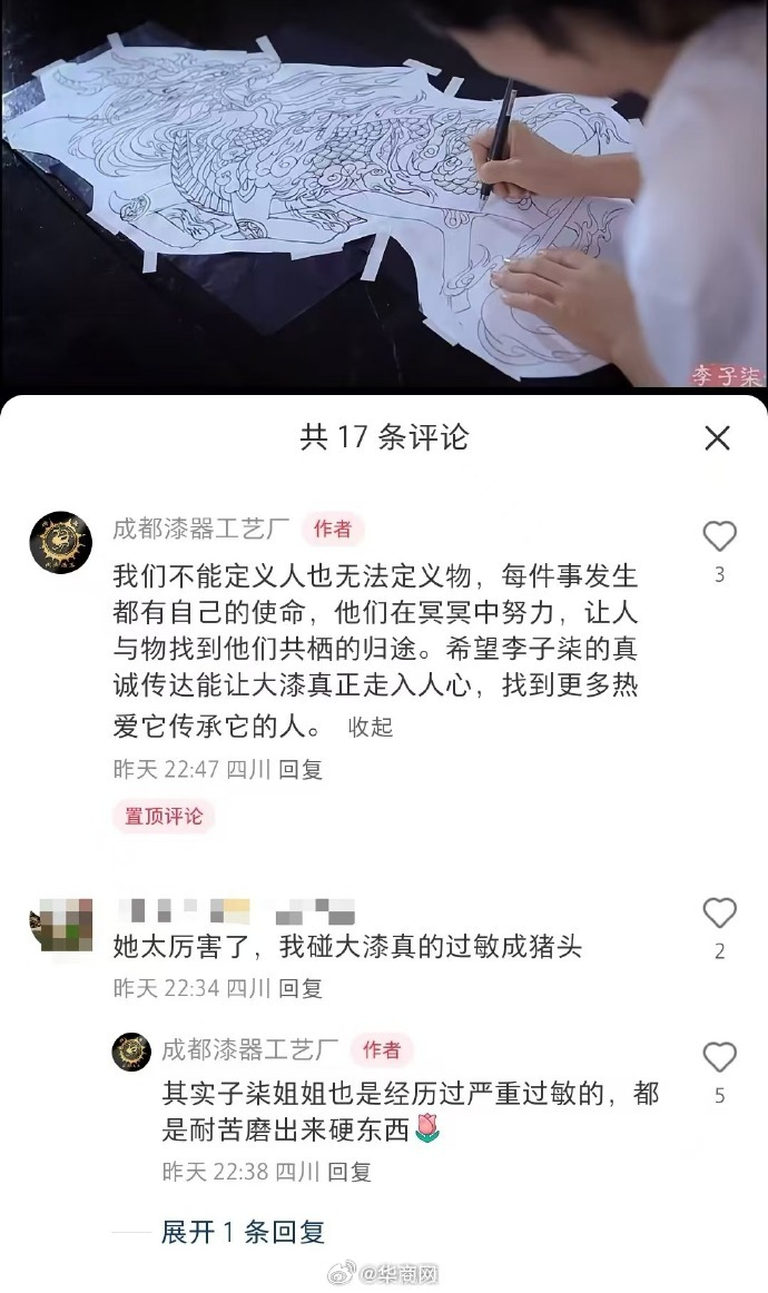 此外,成都漆器工艺厂还回复网友称:“其实李子柒也是经历过严重过敏的,都是耐苦磨出来硬东西。”#李子柒给手工厂提建议从滞销变脱销#