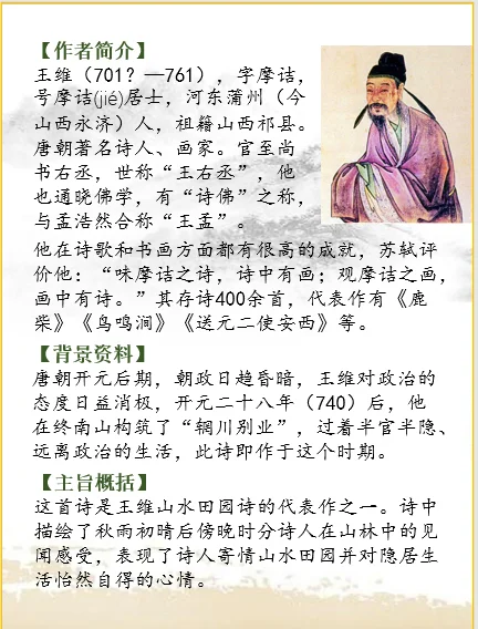 这首诗是王维山水田园诗的代表作之一。诗中描绘了秋雨初晴后傍晚时分诗人在山林中的见闻感受,表现了诗人寄情山水田园并对隐居生活怡然自得的心情。