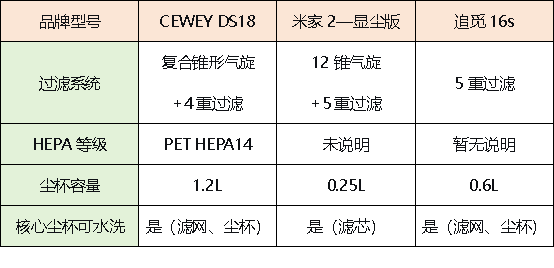 其他款的产品,米家2显尘版虽然过滤气旋数量多,但尘杯容量明显在其中并不占优势,实在有点小。追觅16s过滤系统是5重的,但尘杯容量依然偏小,不过整体看起来中规中矩。