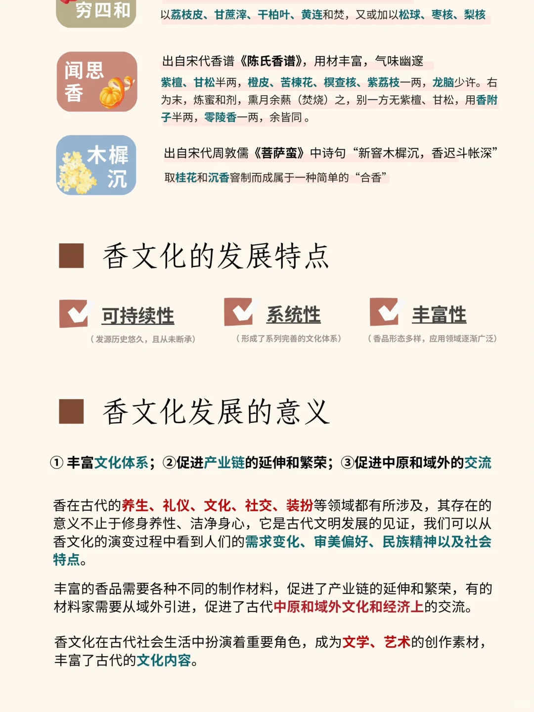 香在古代的养生、礼仪、文化、社交、装扮等领域都有所涉及,其存在的意义不止于修身养性、洁净身心,它是古代文明发展的见证,我们可以从香文化的演变过程中看到人们的需求变化、审美偏好、民族精神以及社会特点。总之,香文化在古代社会生活中扮演着重要角色,不仅和人们的日常生活息息相关,还并成为文学、艺术的创作素材,承担着“实用”和“浪漫”的双重意义。