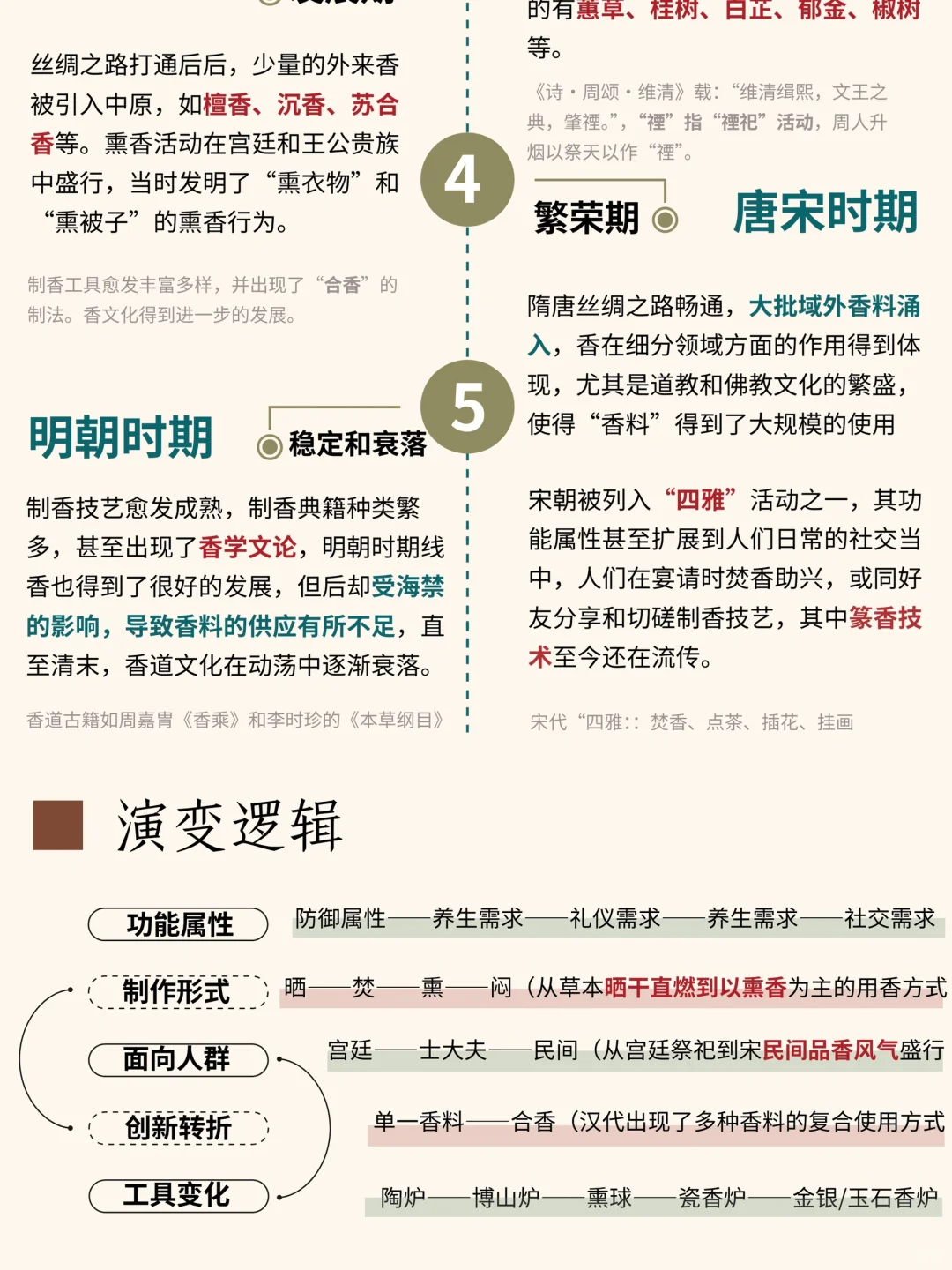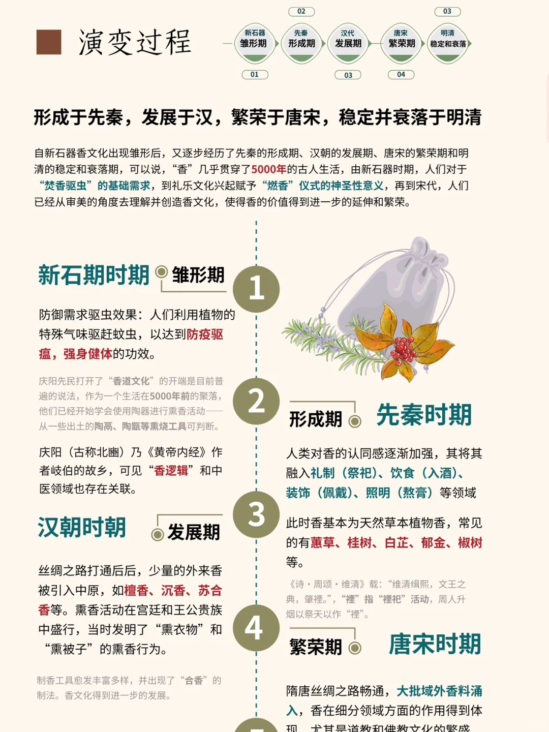 自新石器香文化出现雏形后,又逐步经历了先秦的形成期、汉朝的发展期、唐宋的繁荣期和明清的稳定和衰落期,可以说,“香”几乎贯穿了5000年的古人生活由新石器时期,人们对于“焚香驱虫”的基础需求,到礼乐文化兴起赋予“燃香”仪式的神圣性意义,再到宋代,人们已经从审美的角度去理解并创造香文化,使得香的价值得到进一步的延伸和繁荣。