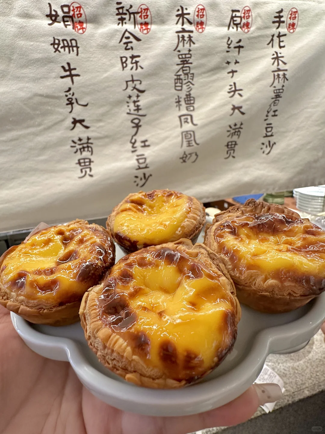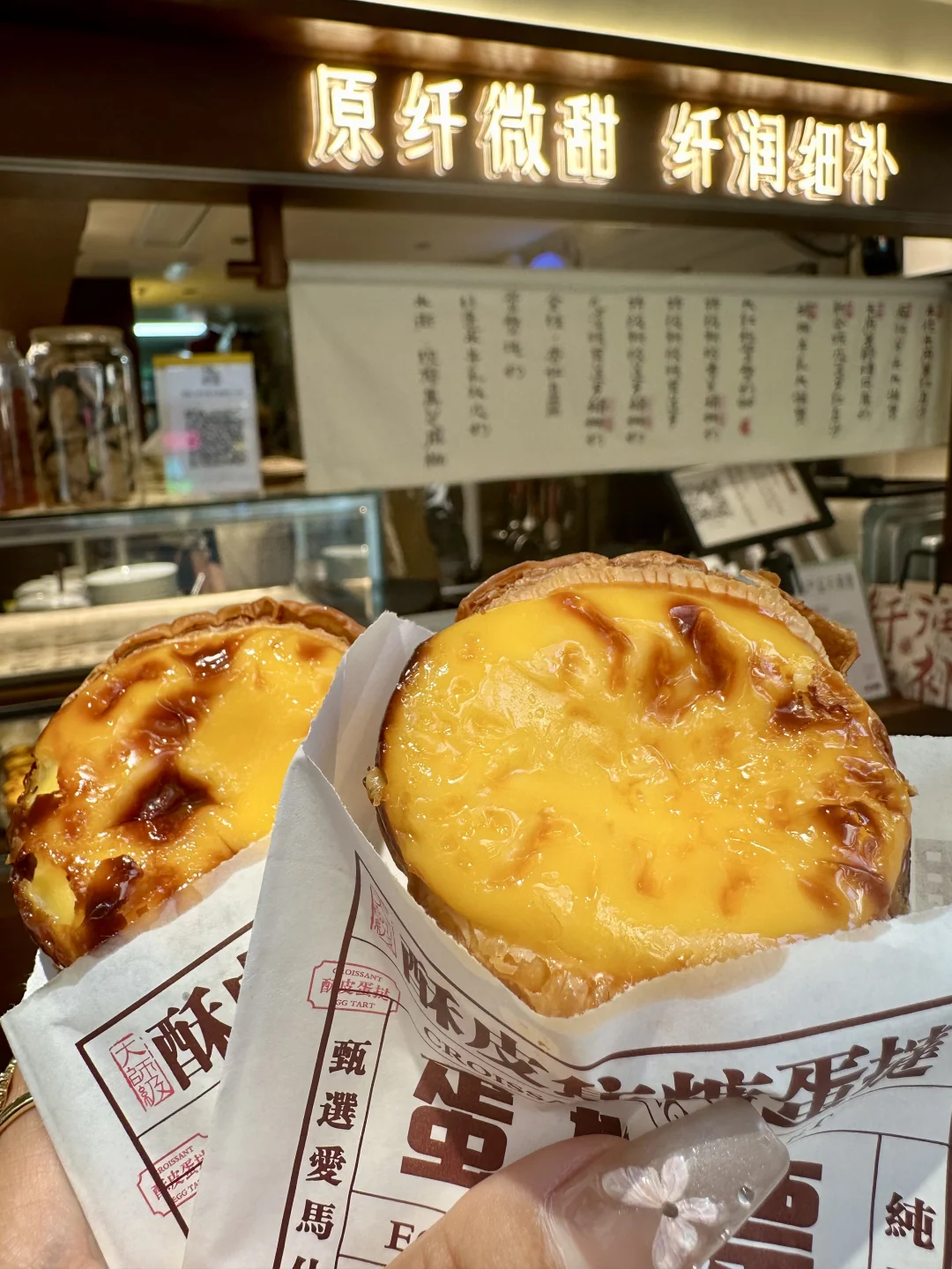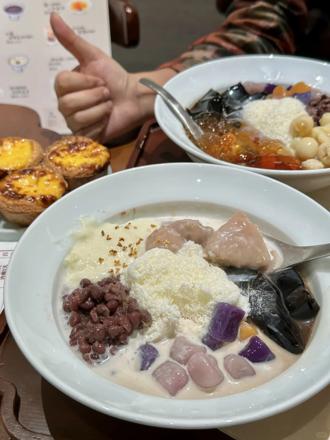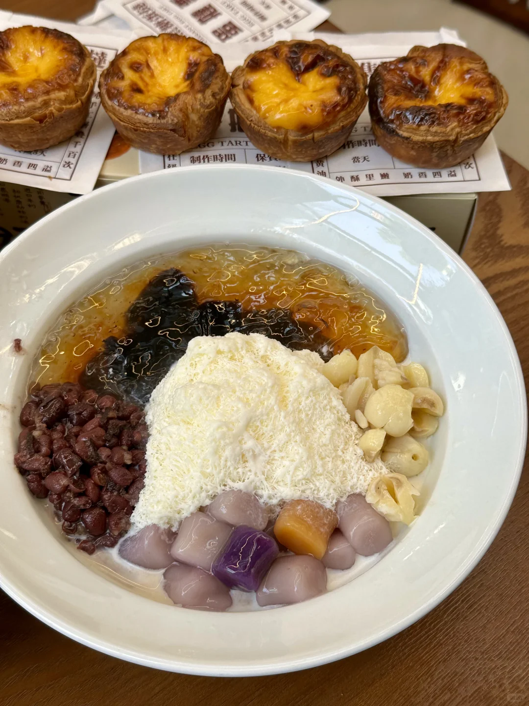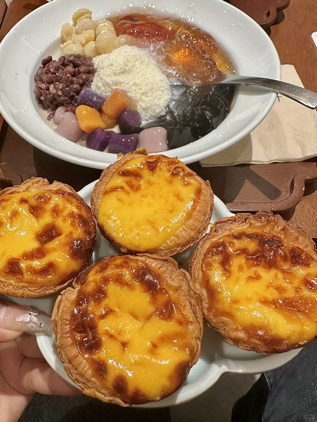 最近真的被刷屏了!!让姐妹提前去排队,终于算是吃上了! ! [先说结论好吃! !确实有两下子!!🥵🥵🥵 蛋挞内馅软嫩,外皮咬下去的确特别酥脆! !吃起来有焦糖味道👌👌👌 他家的招牌雪冰牛乳大满贯,和普通的不一样,奶香浓郁完全不甜,里面还有胶质满满的桃胶,芋圆,红豆,莲子……