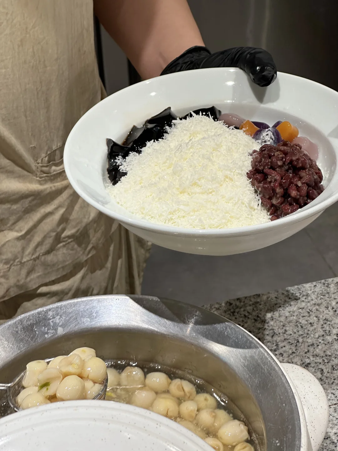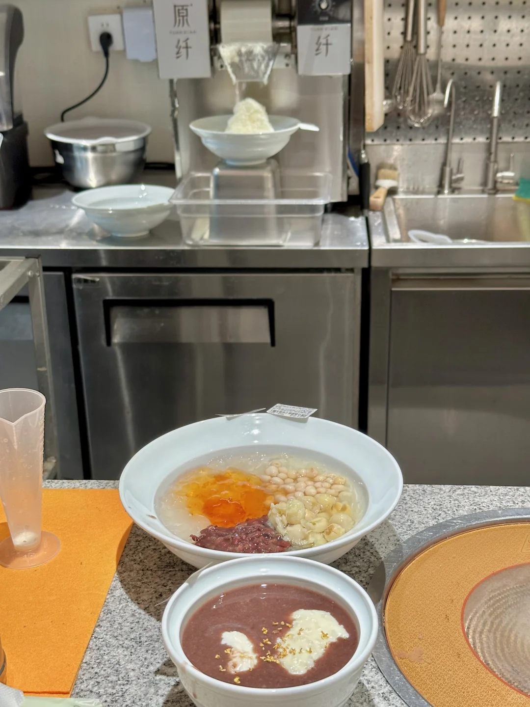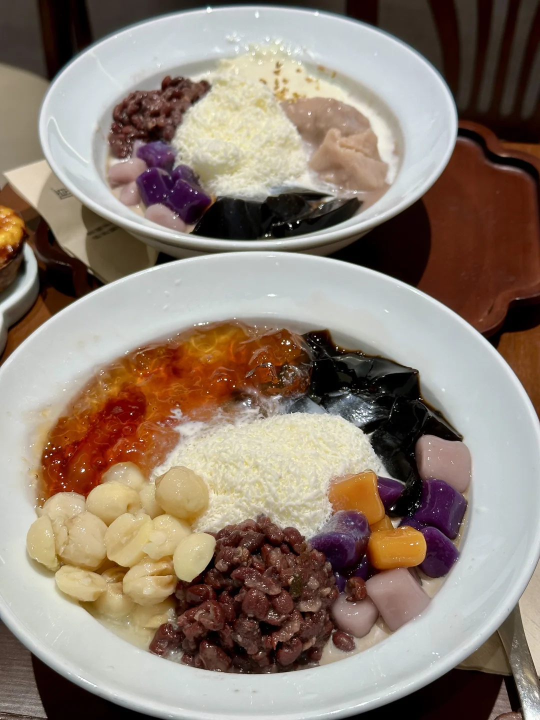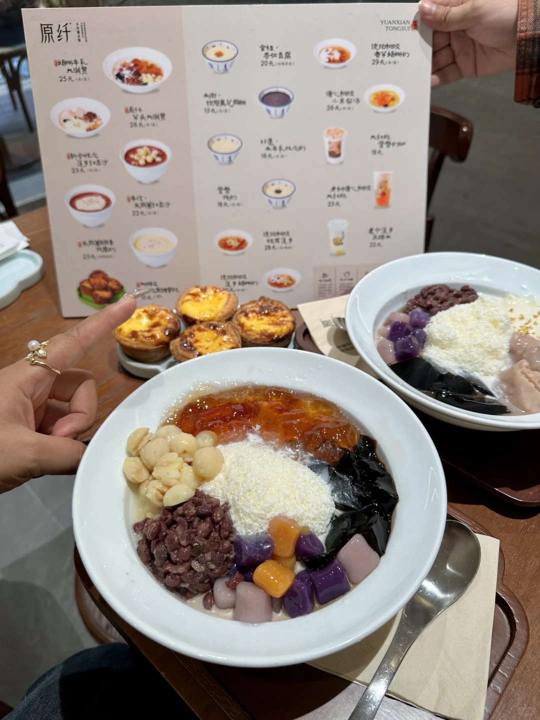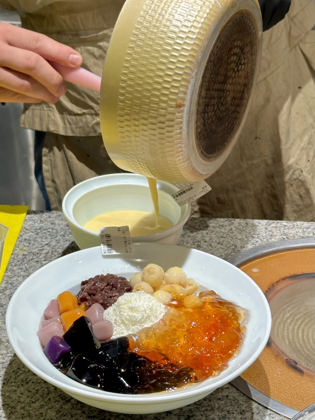 最近真的被刷屏了!!让姐妹提前去排队,终于算是吃上了! ! [先说结论好吃! !确实有两下子!!🥵🥵🥵 蛋挞内馅软嫩,外皮咬下去的确特别酥脆! !吃起来有焦糖味道👌👌👌 他家的招牌雪冰牛乳大满贯,和普通的不一样,奶香浓郁完全不甜,里面还有胶质满满的桃胶,芋圆,红豆,莲子……