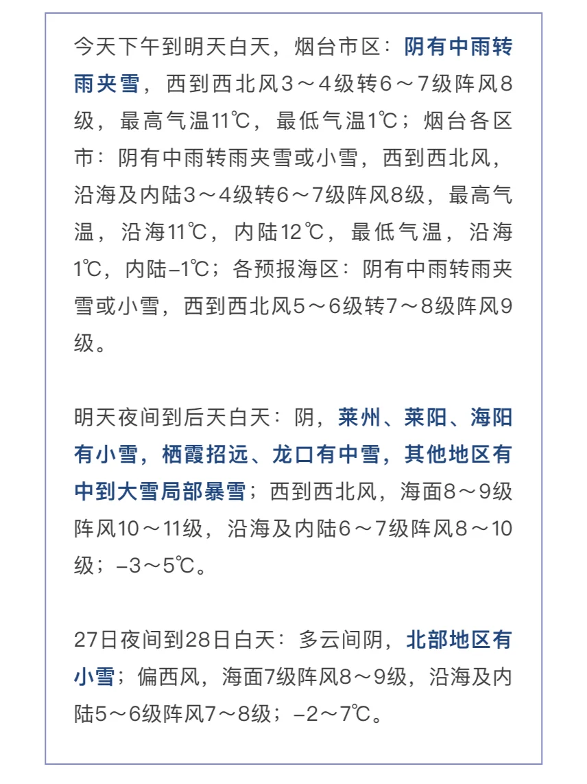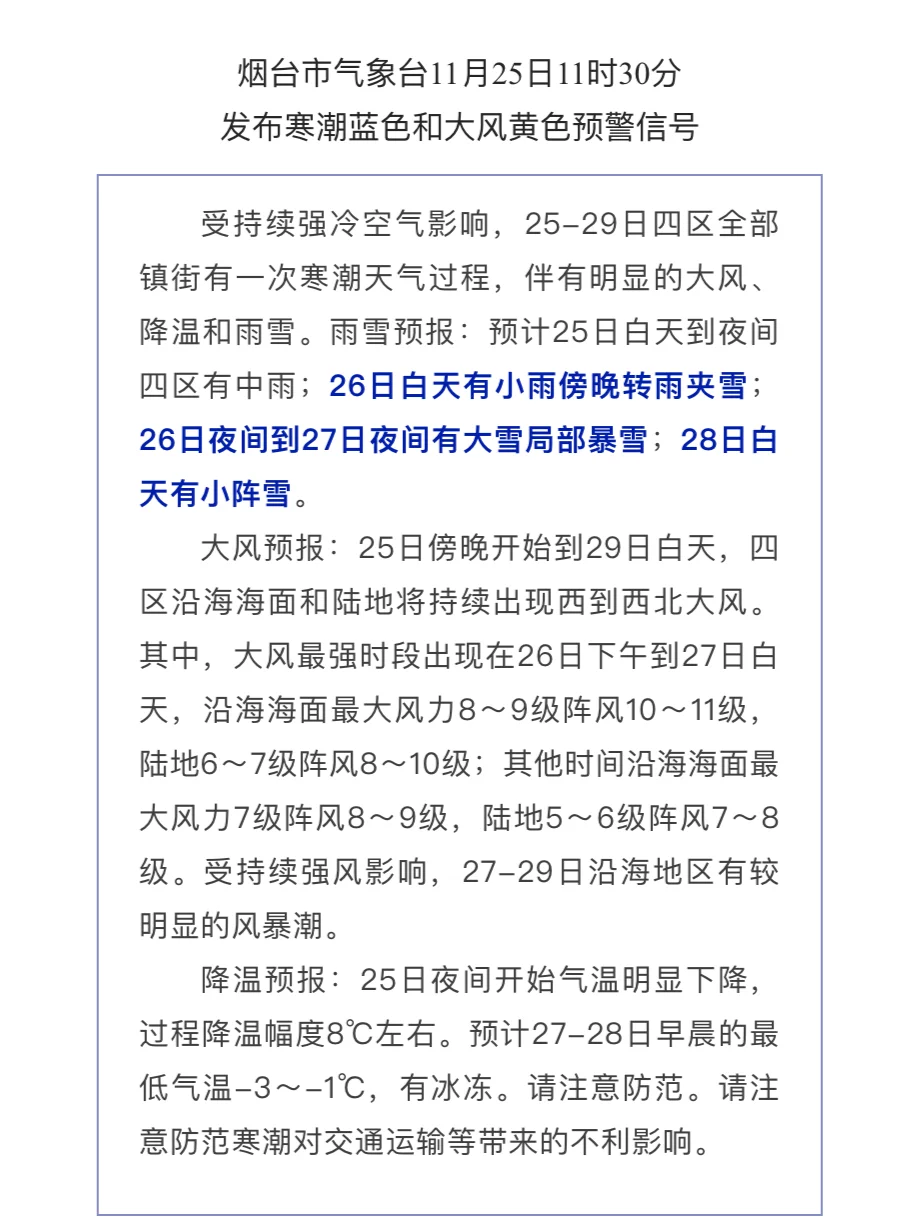 [星R]受持续强冷空气影响,25-29日四区全部镇街有一次寒潮天气过程,伴有明显的大风、降温和雨雪。雨雪预报:预计25日白天到夜间四区有中雨[流汗R];26日白天有小雨傍晚转雨夹雪;26日夜间到27日夜间有大雪局部暴雪;28日白天有小阵雪。