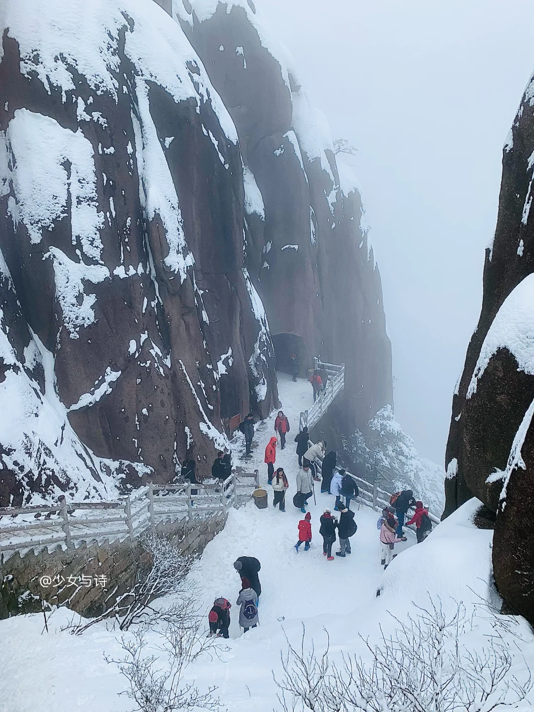 穿好保暖羽绒服🧥、防水防滑雪地靴👢,戴上围巾🧣、手套🧤、帽子🎩,带上冰爪、登山杖,还有充电宝🔋和保温杯🥛哦。记得提前在黄山旅游官方平台预订门票和索道票📱。