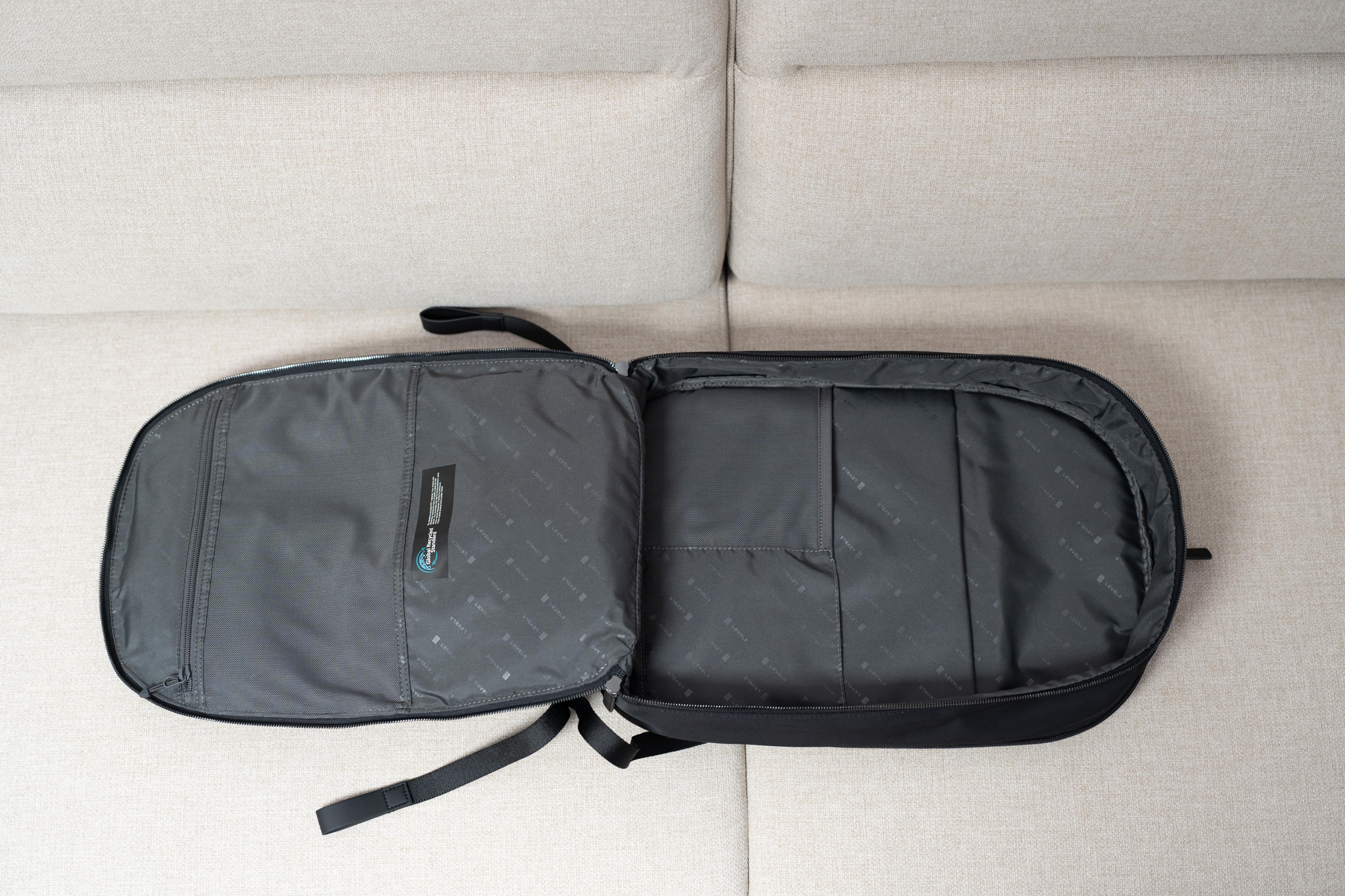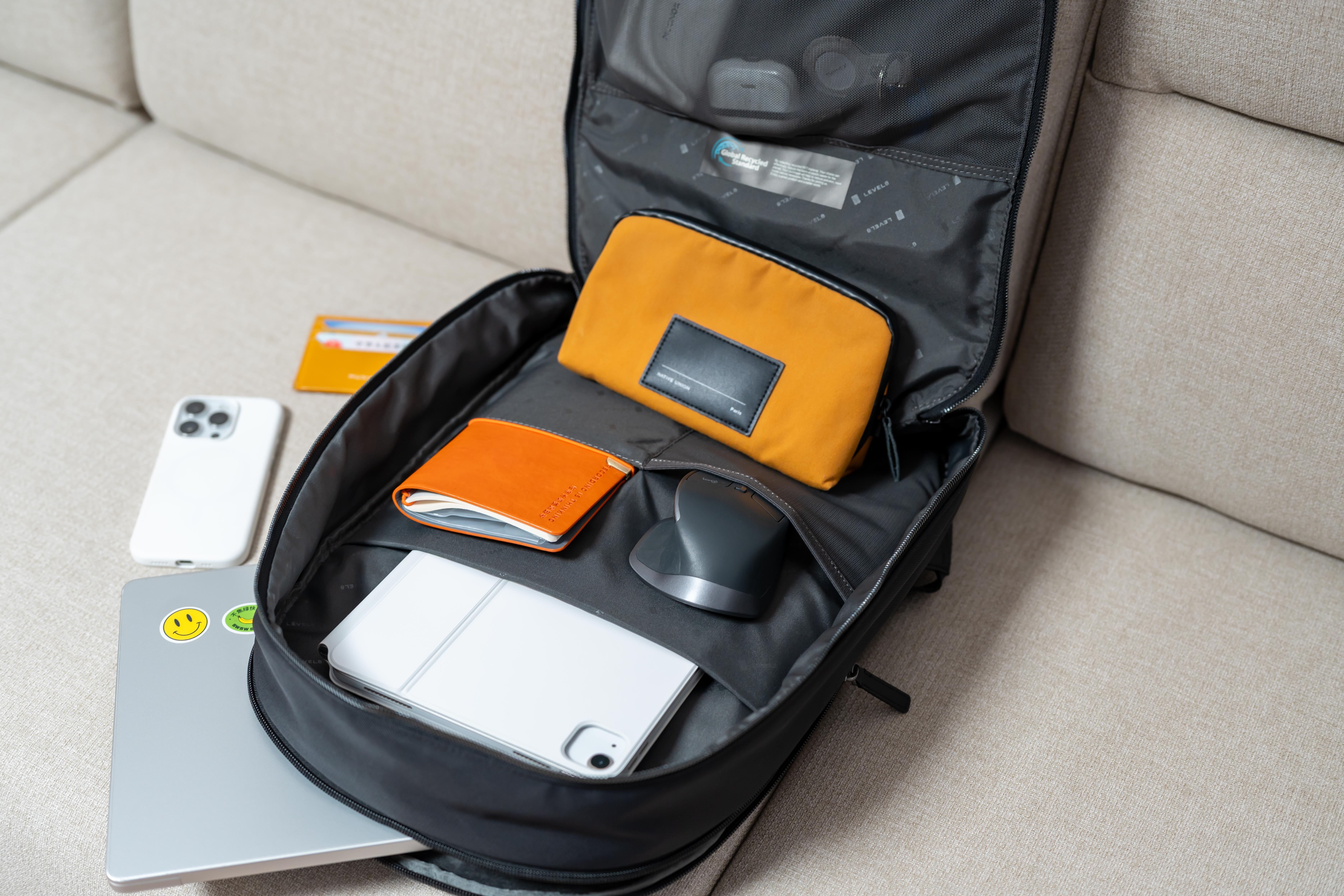 背包的主仓容量为 19L,对于短期出差或者日常通勤携带较多物品的情况完全能够胜任。以1-2 天的短途出差为例,用它轻松装下了电脑、平板、数码配件、换洗衣物以及洗漱用品。