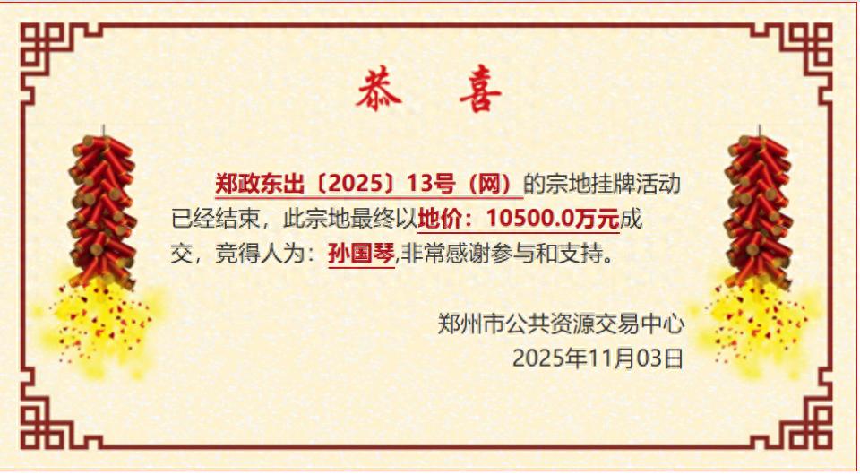 溢价2500万元!11月3日,郑东新区又一商业用地完成出让,最终以1.05亿元成交,竞得人为孙国琴。